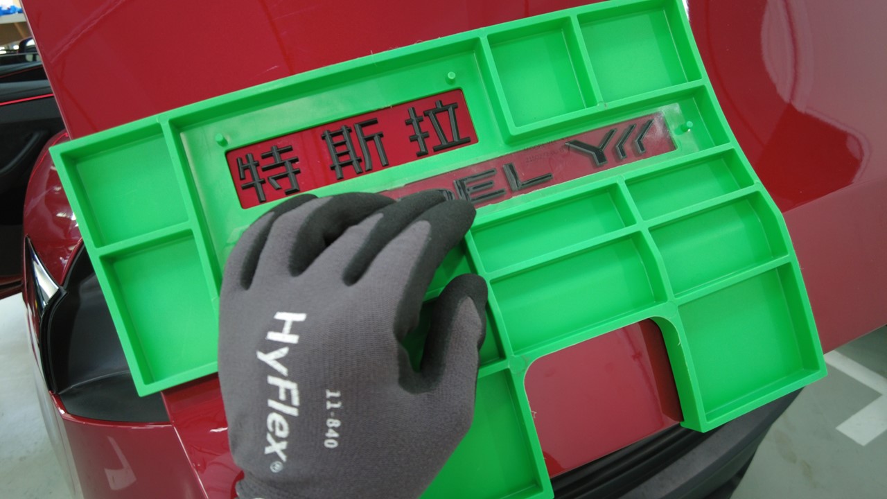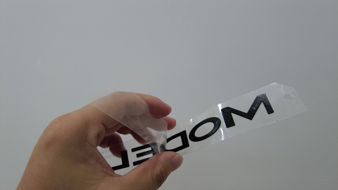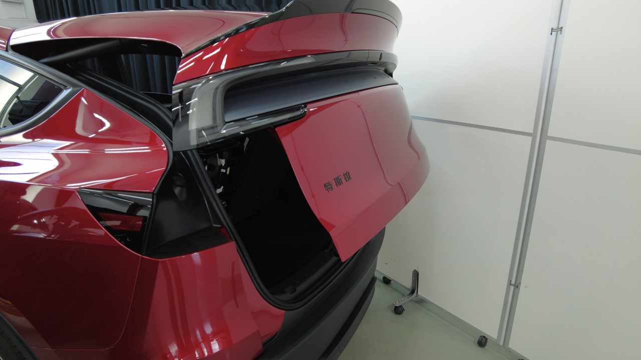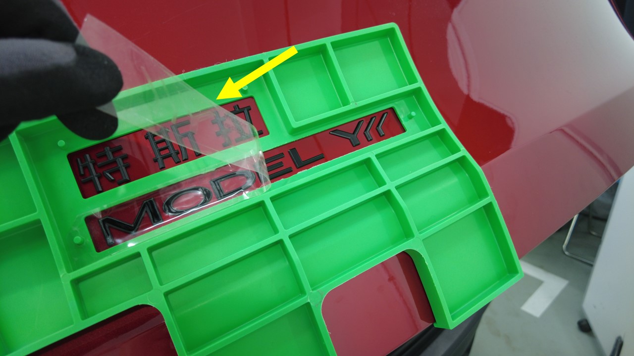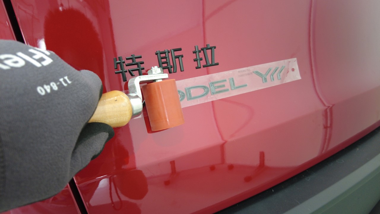 关闭掀背尾门,将保护膜放置在徽标上,使用滚压机 (1049517-00-A) 彻底压实徽标,然后揭下保护膜。