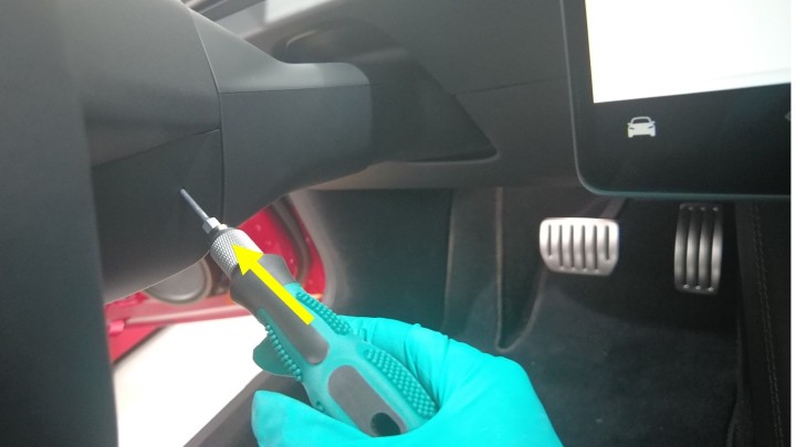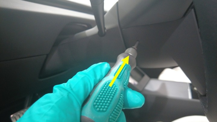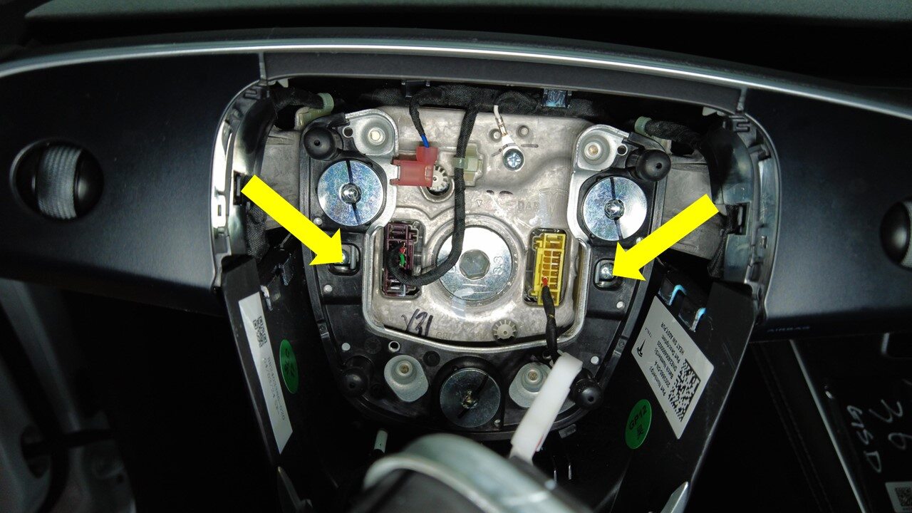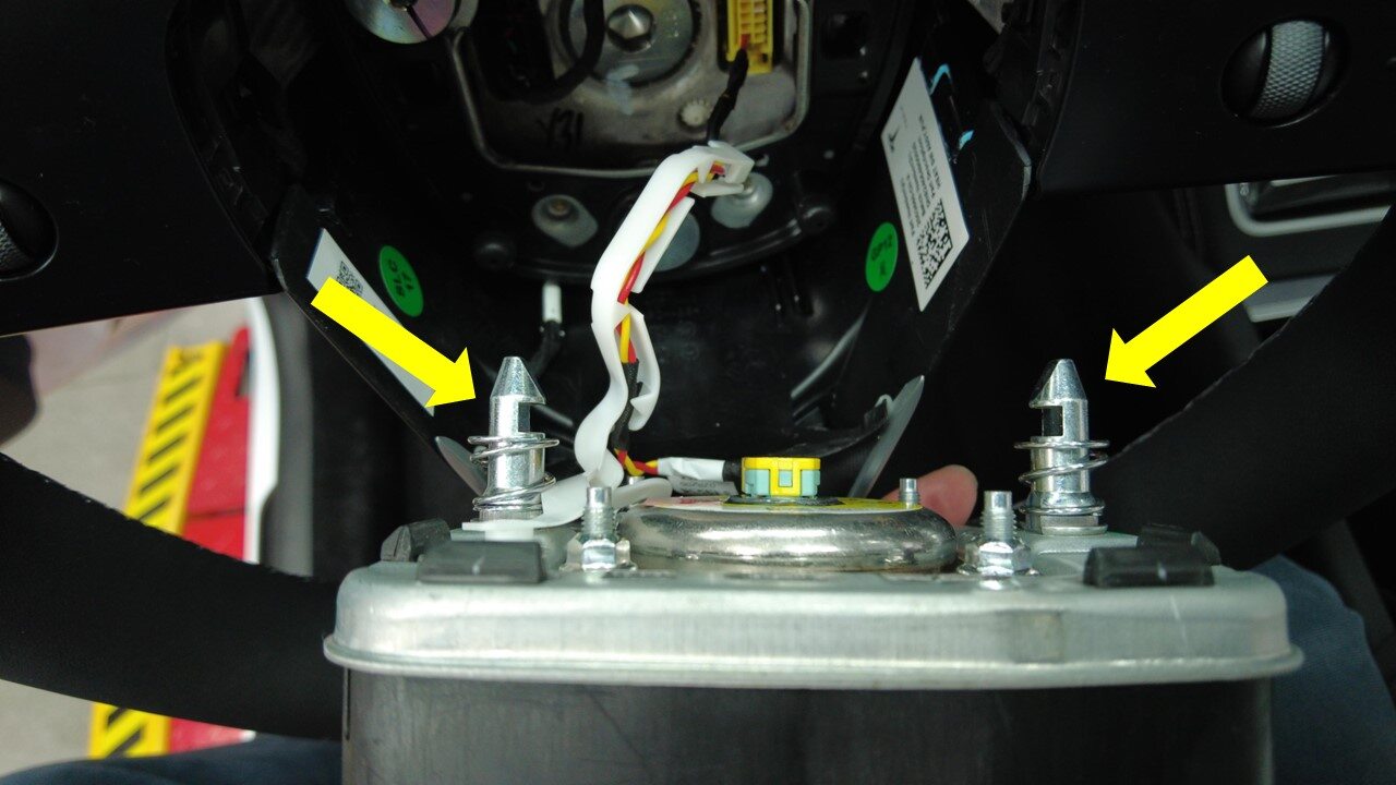 使用气囊拆卸工具 (2098130-00-A) 按压 2 个检修孔上的弹簧夹(2 个),将驾驶位气囊从方向盘上松开,然后将气囊部分拉离方向盘。