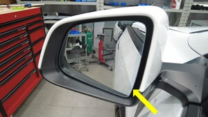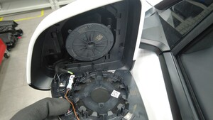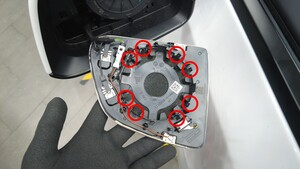 对齐后视镜玻璃中心和后视镜总成中心,然后安装后视镜玻璃,确保锁片(8 个)完全接合。