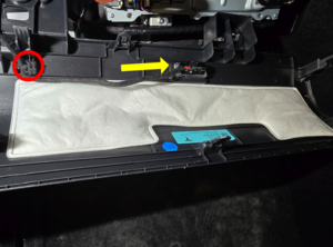 断开电气连接器,然后安装将副驾位脚部空间盖板固定到车辆的卡子。