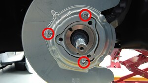 拆下将左前制动器防护罩固定到转向节的螺栓(3 个),然后将制动器防护罩从车辆上拆下。