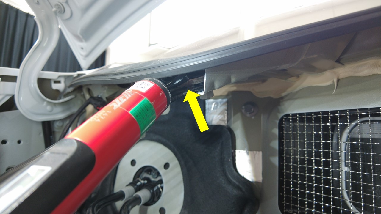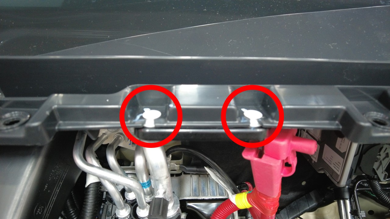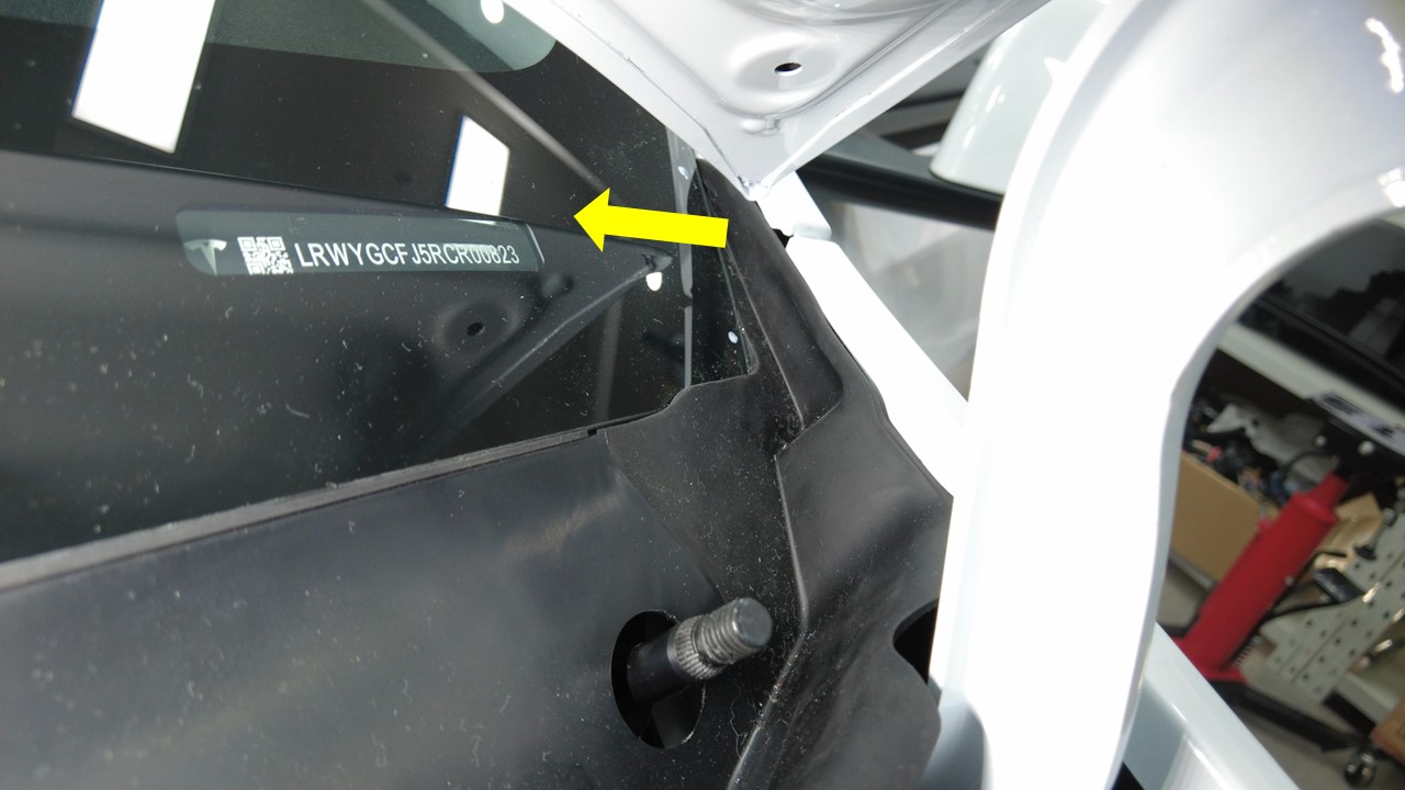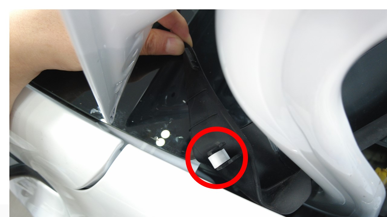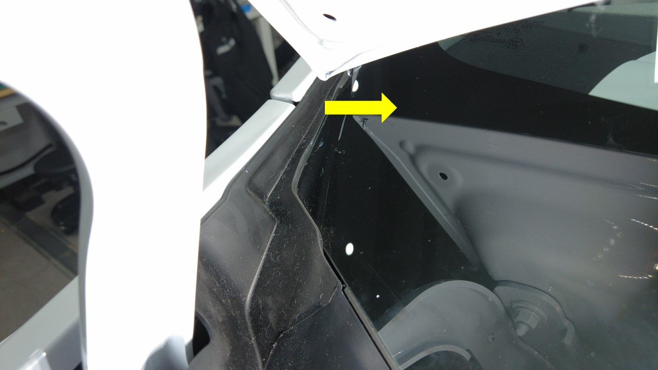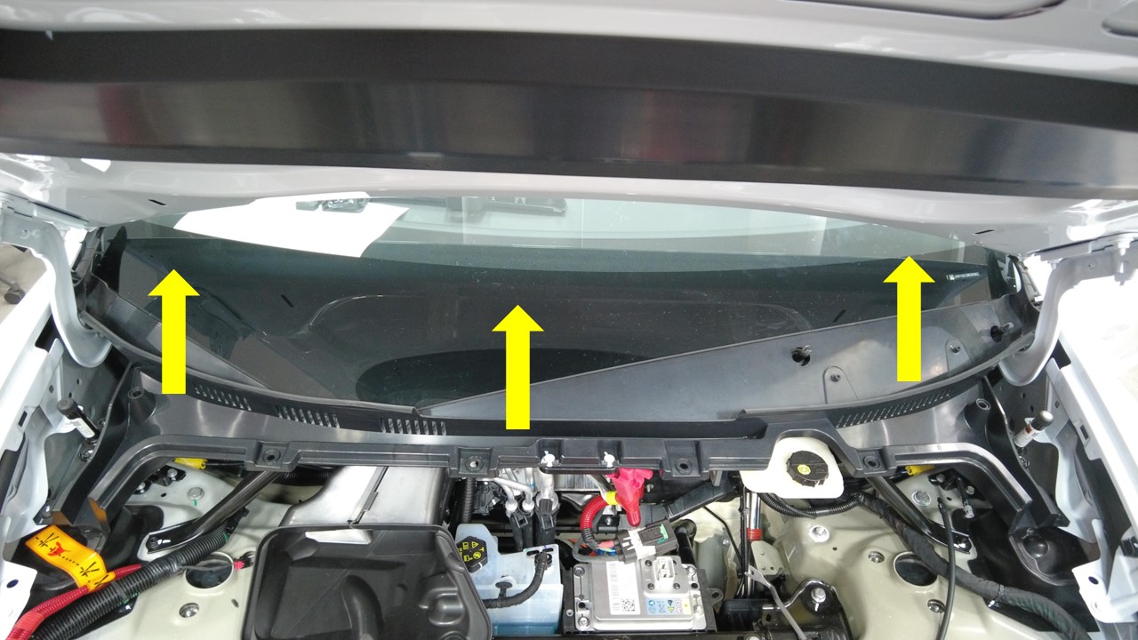 安装卡子(4 个),将前围篦板两侧角部按压到车身上,确保前围篦板正确就位于挡风玻璃上。