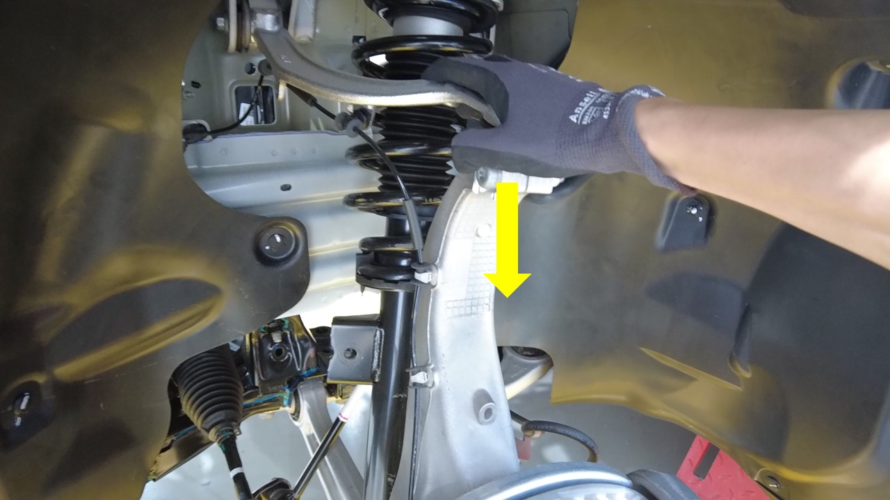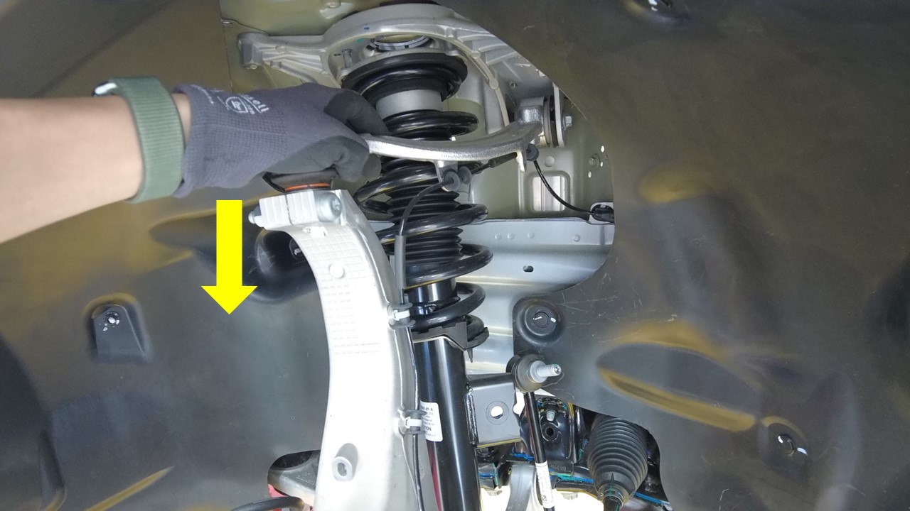 拆下将右前下方横向连杆固定到支柱的螺栓和螺母。