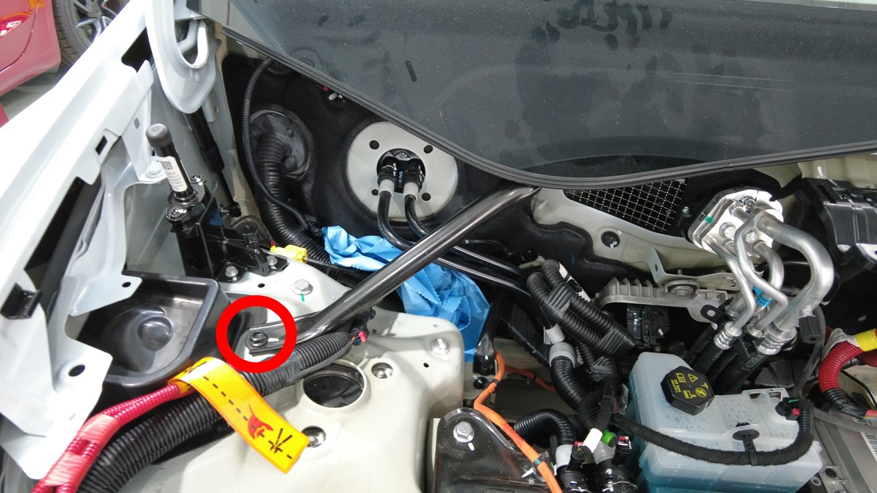 将前平衡杆末端连杆放置在右前支柱上,然后安装新的螺母,将前平衡杆末端连杆固定到右前支柱。