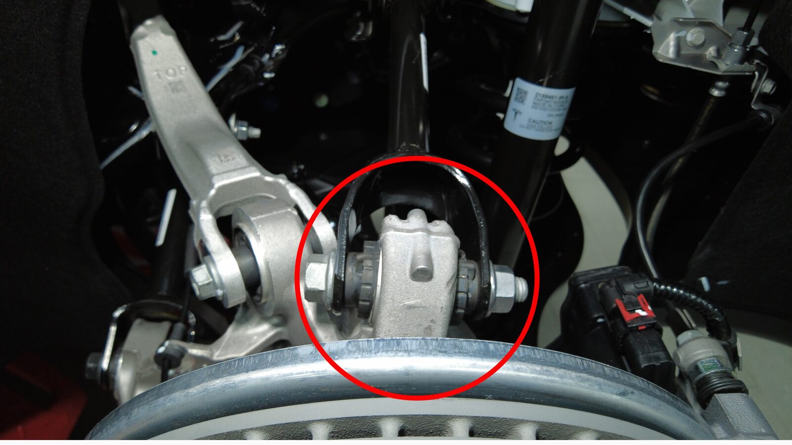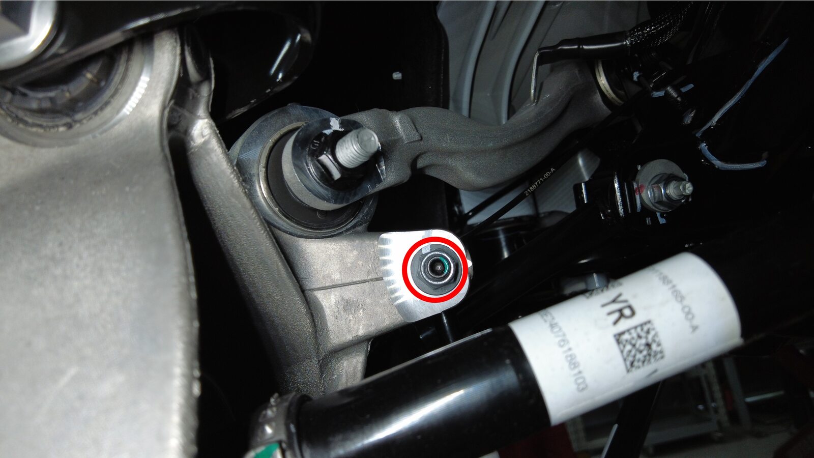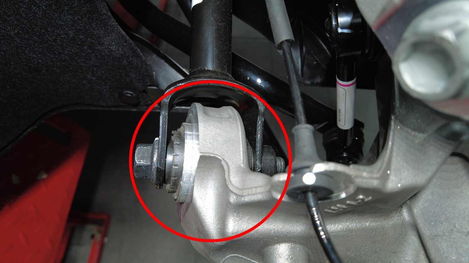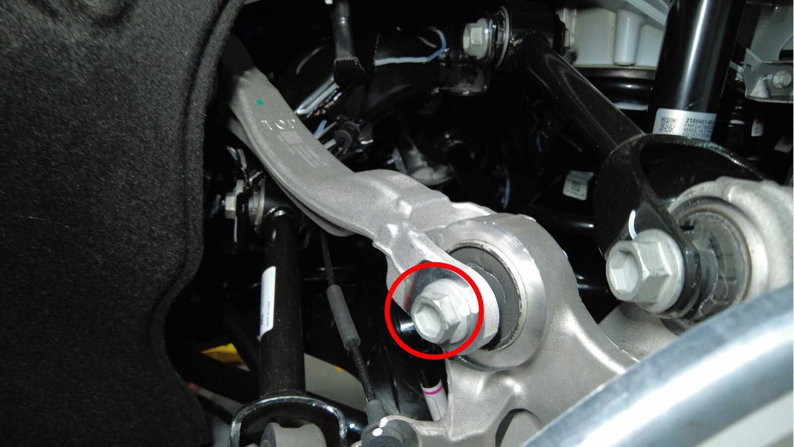 紧固将左后下前连杆固定到左后转向节的螺栓和螺母。使用油性记号笔标记螺栓。