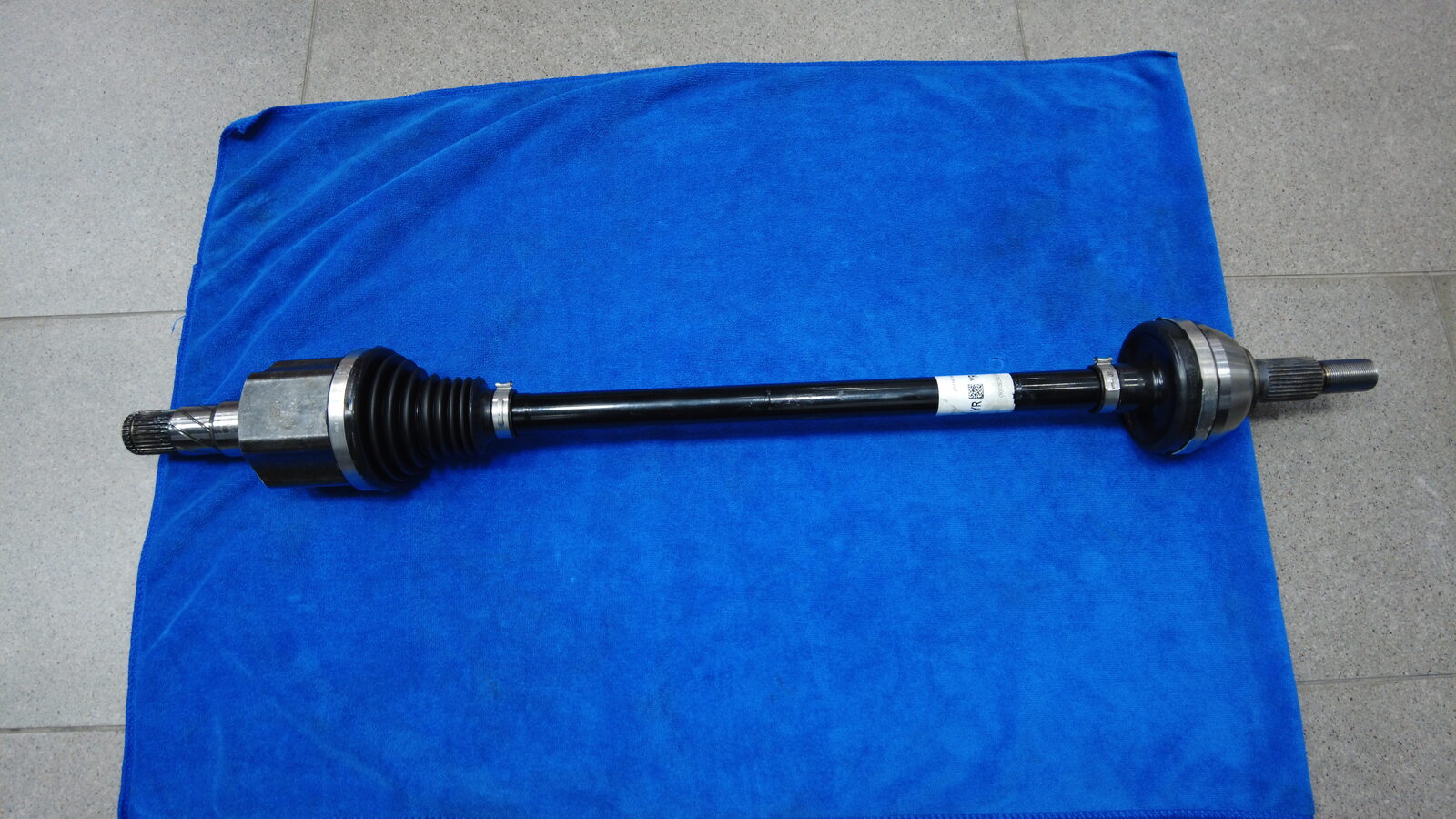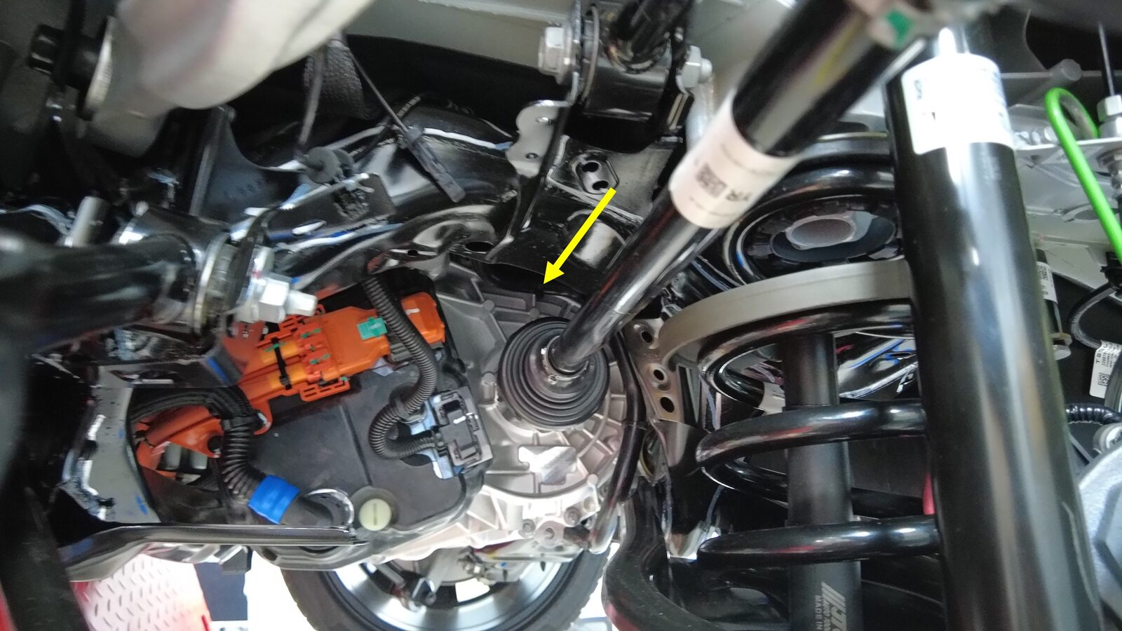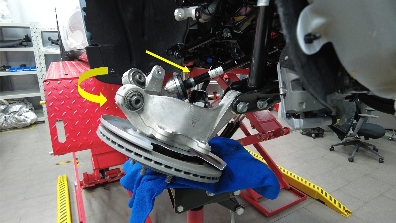 在协助下,将半轴安装到轮毂轴承上,然后摆动安装左后转向节上部。