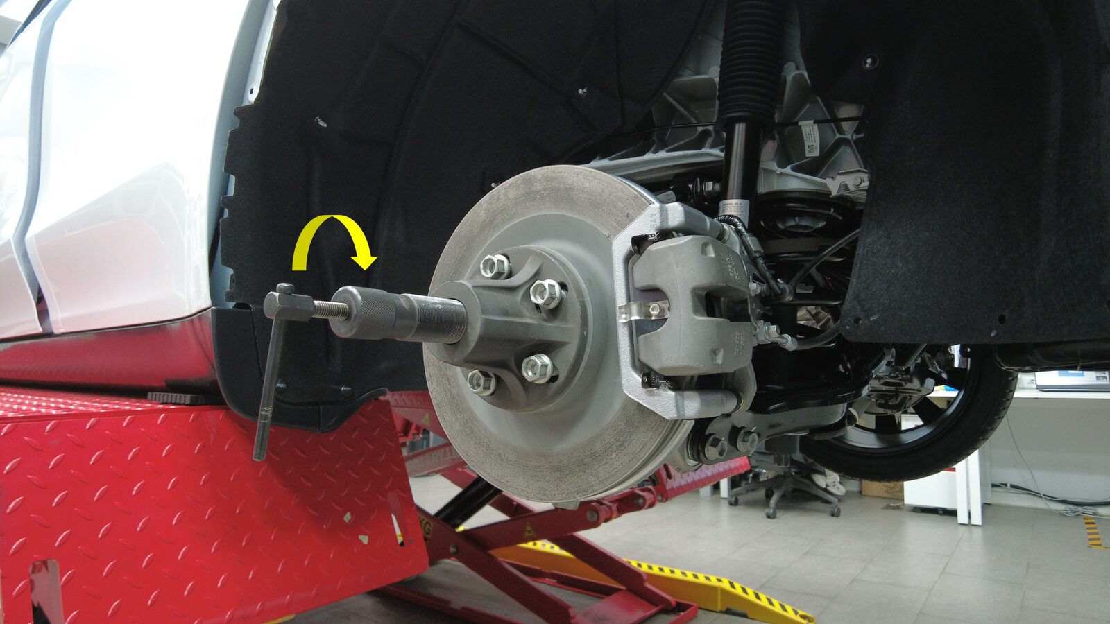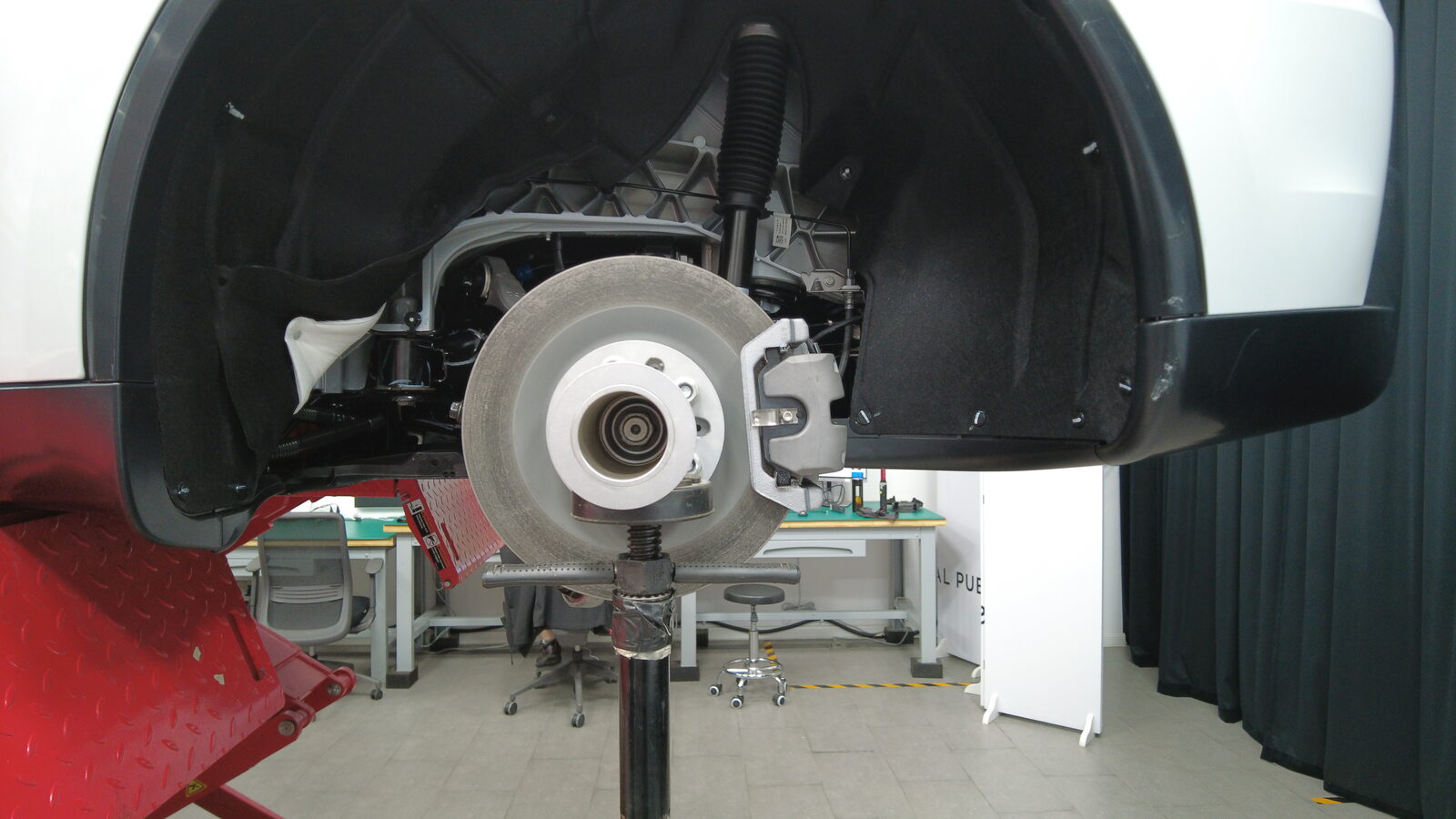 在左后悬架弹簧上安装一个弹簧压缩器: