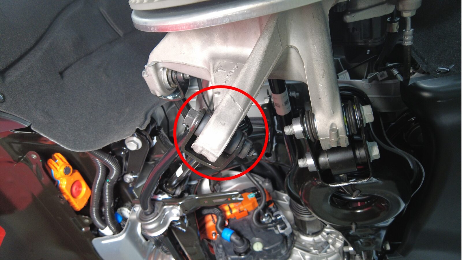 将左后止推杆放置到转向节上,然后安装螺栓和螺母并手动拧紧。