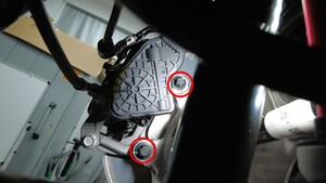 拆下并弃用将左后制动钳固定到左后转向节的螺栓(2 个),将制动钳从转向节上拆下,然后将其挂在 S 型钩上。