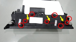 松开将手套箱固定到仪表板支架的卡子(8 个)和定位销(3 个),然后小心地将手套箱从内侧向外拉动。