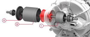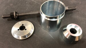 将变速箱衬套拆卸皮碗和螺柱安装到右侧衬套上,然后使用皮碗 K、B 和 I 使衬套从前驱动单元脱离。