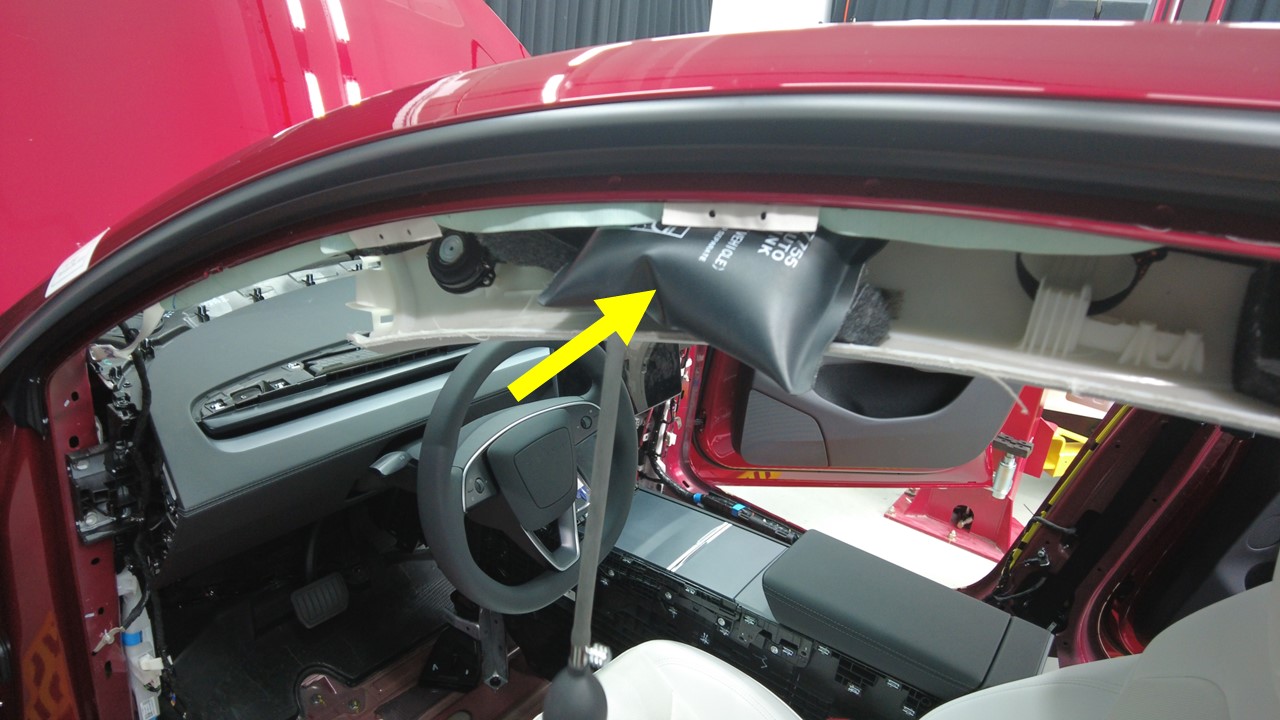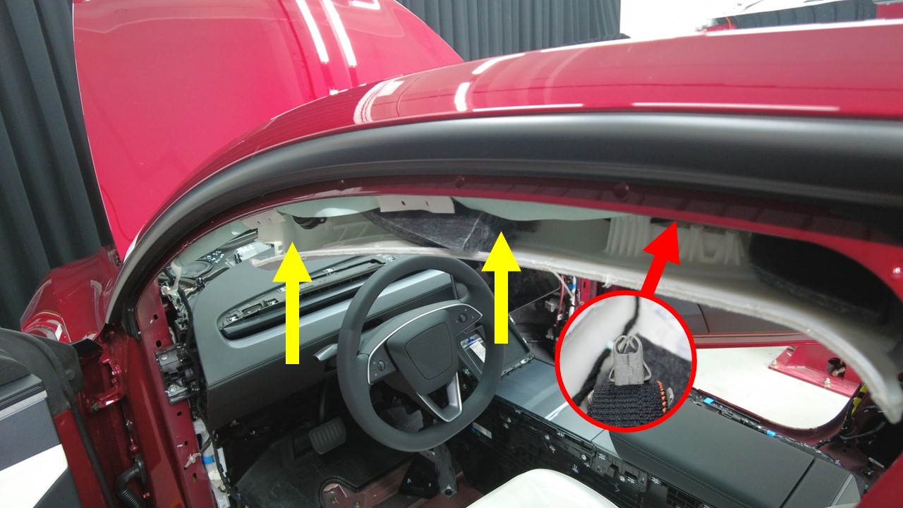 松开左侧前顶衬区域的高强度固定卡扣,然后向下拉出左侧前顶棚,并使用充气气囊支撑顶棚。