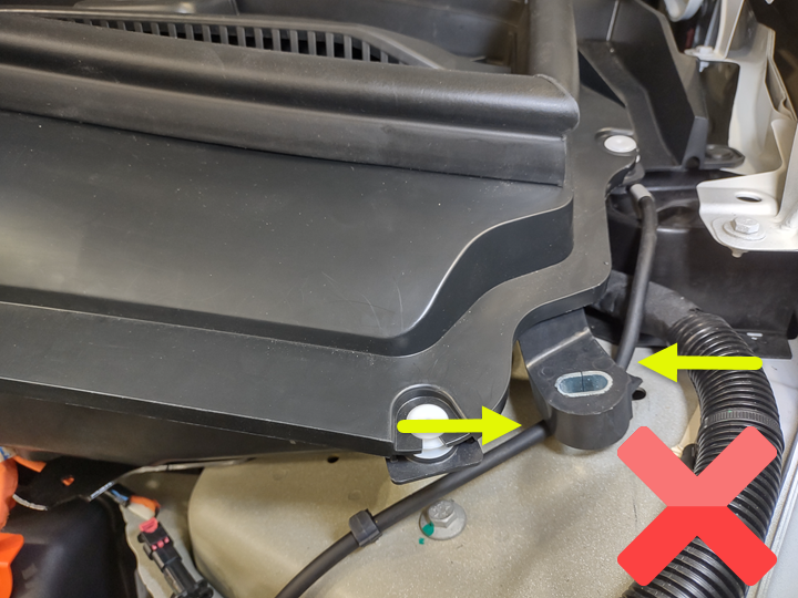 将高效分子空气 (HEPA) 过滤器总成放置入位,以备安装,请将过滤器总成的前边缘置于前备箱储物单元下方,然后小心地将过滤器总成的后边缘移过制动液储液罐。轻轻地按压过滤器右侧,将密封件固定在管道上。