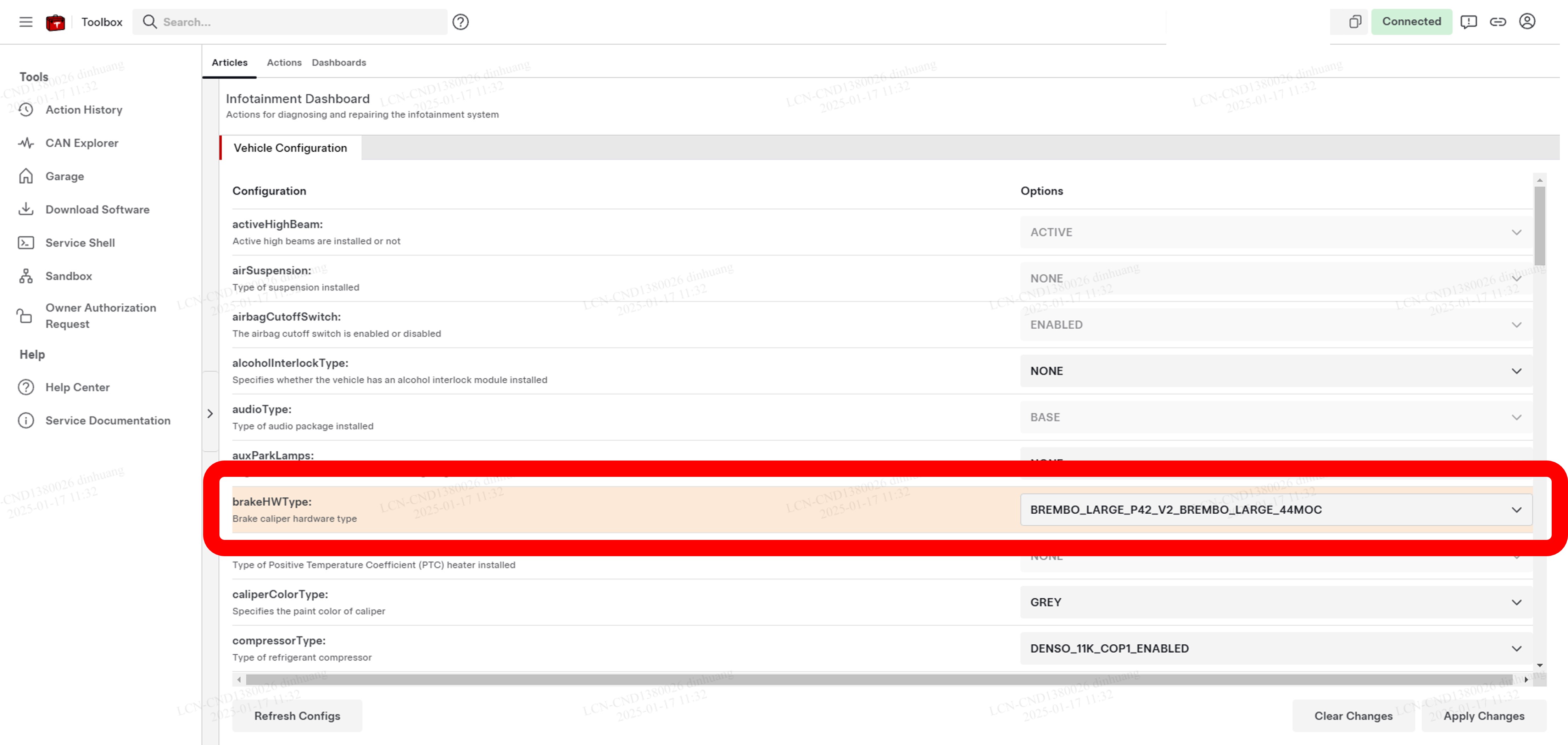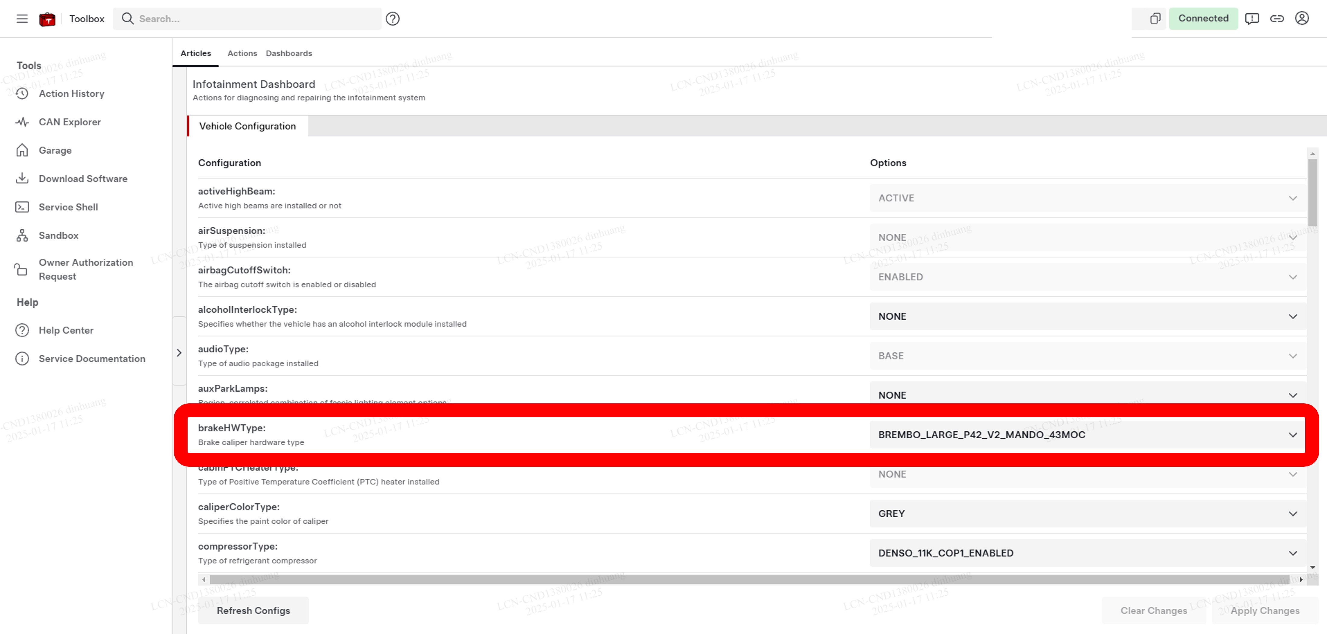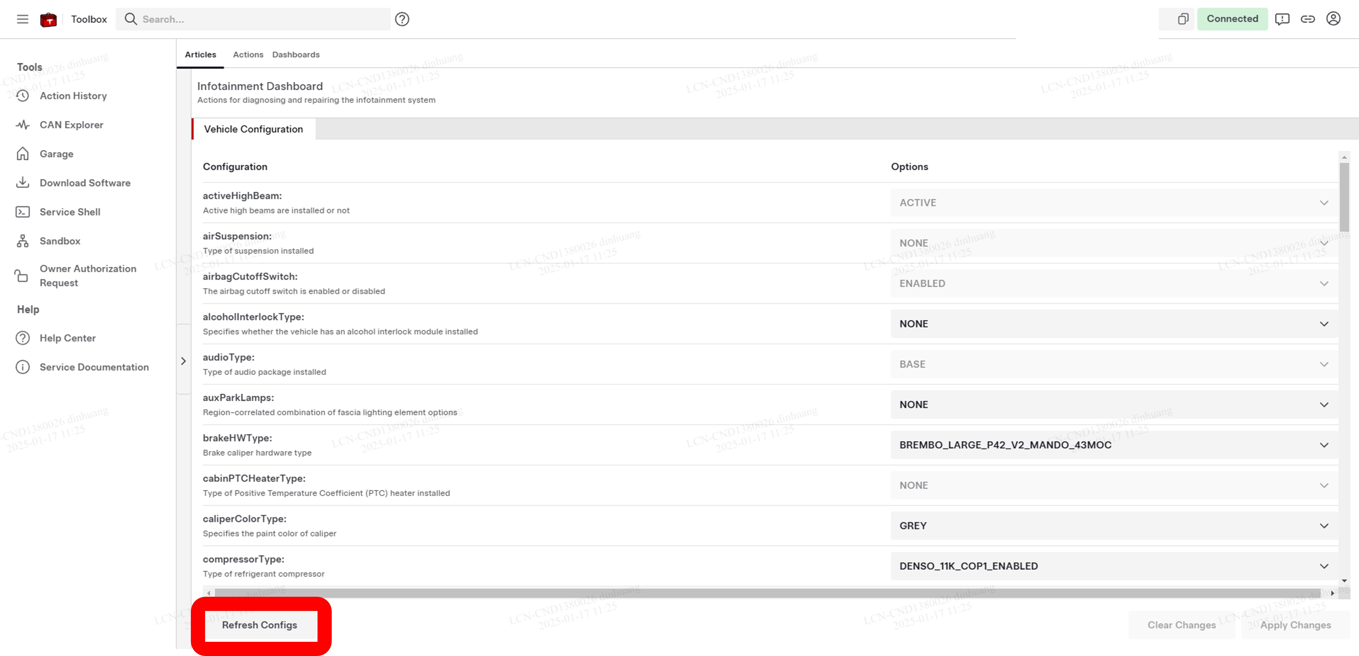 注连接后,电脑会自动进入Vehicle Configuration选项卡。如果未显示任何配置参数,请点击屏幕左侧底部的Refresh Configs按钮刷新页面。