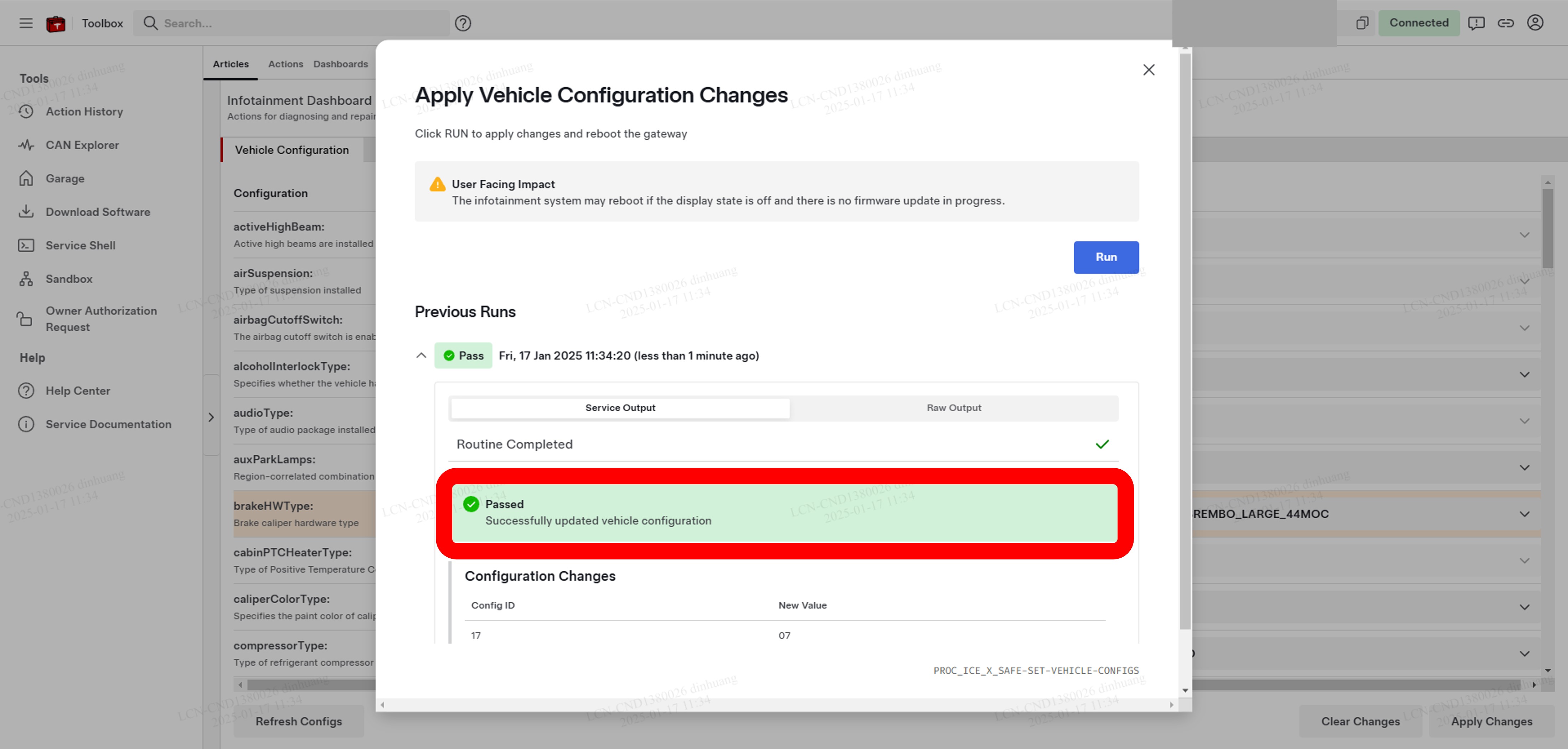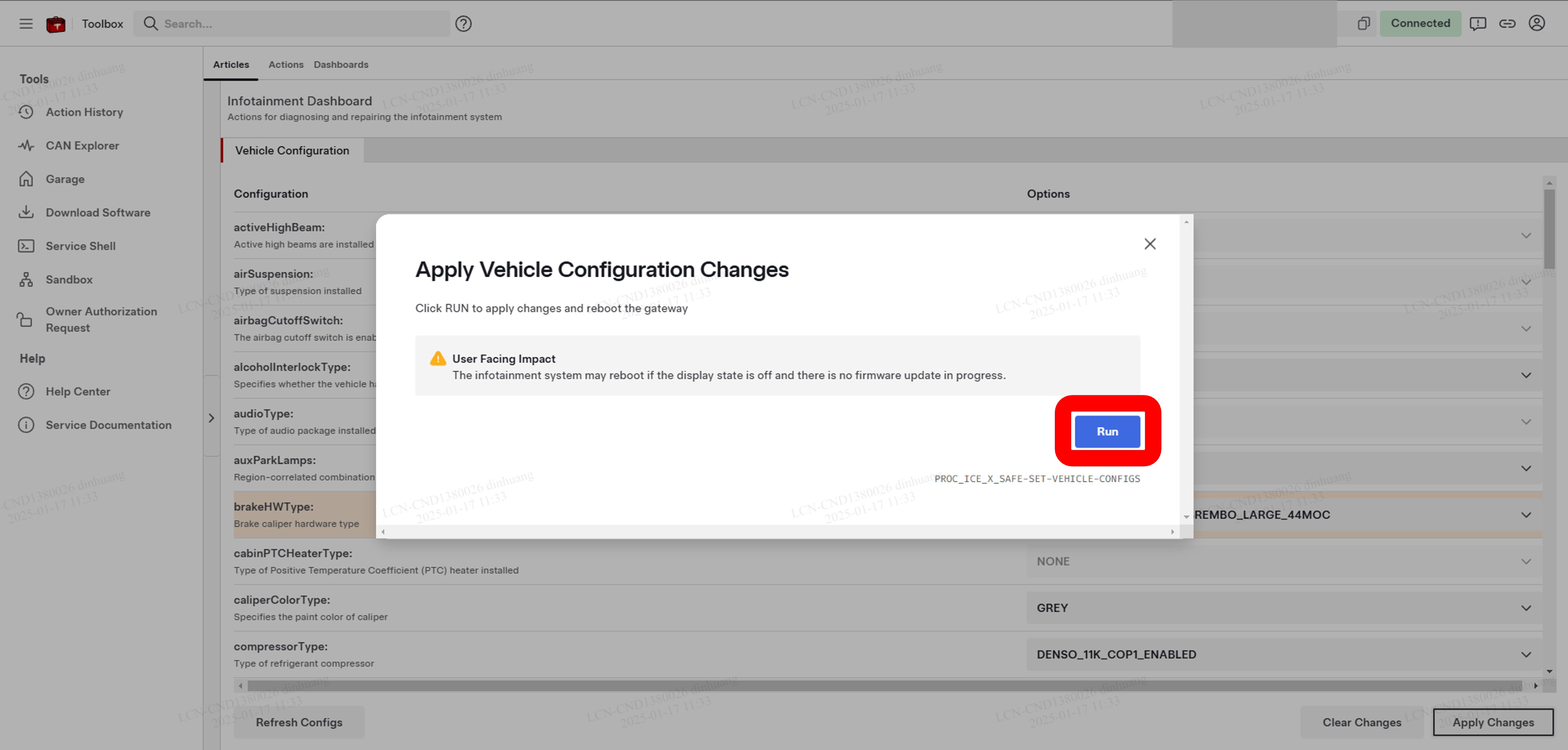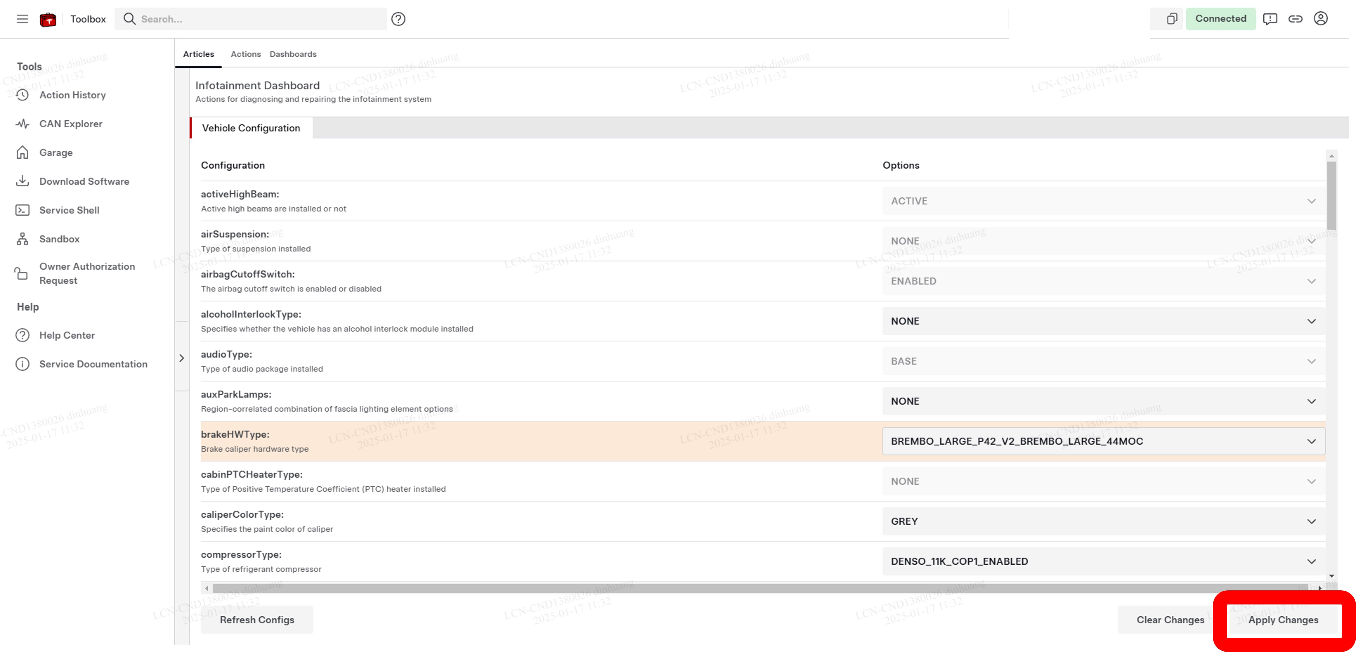 注连接后,电脑会自动进入Vehicle Configuration选项卡。如果未显示任何配置参数,请点击屏幕左侧底部的Refresh Configs按钮刷新页面。