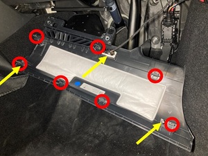 断开路面照明灯连接器上的电气线束,然后将驾驶位脚部空间隔音板从车辆上拆下。