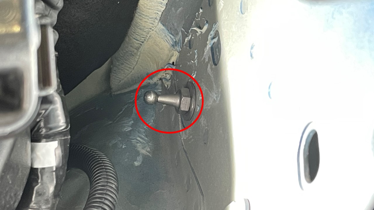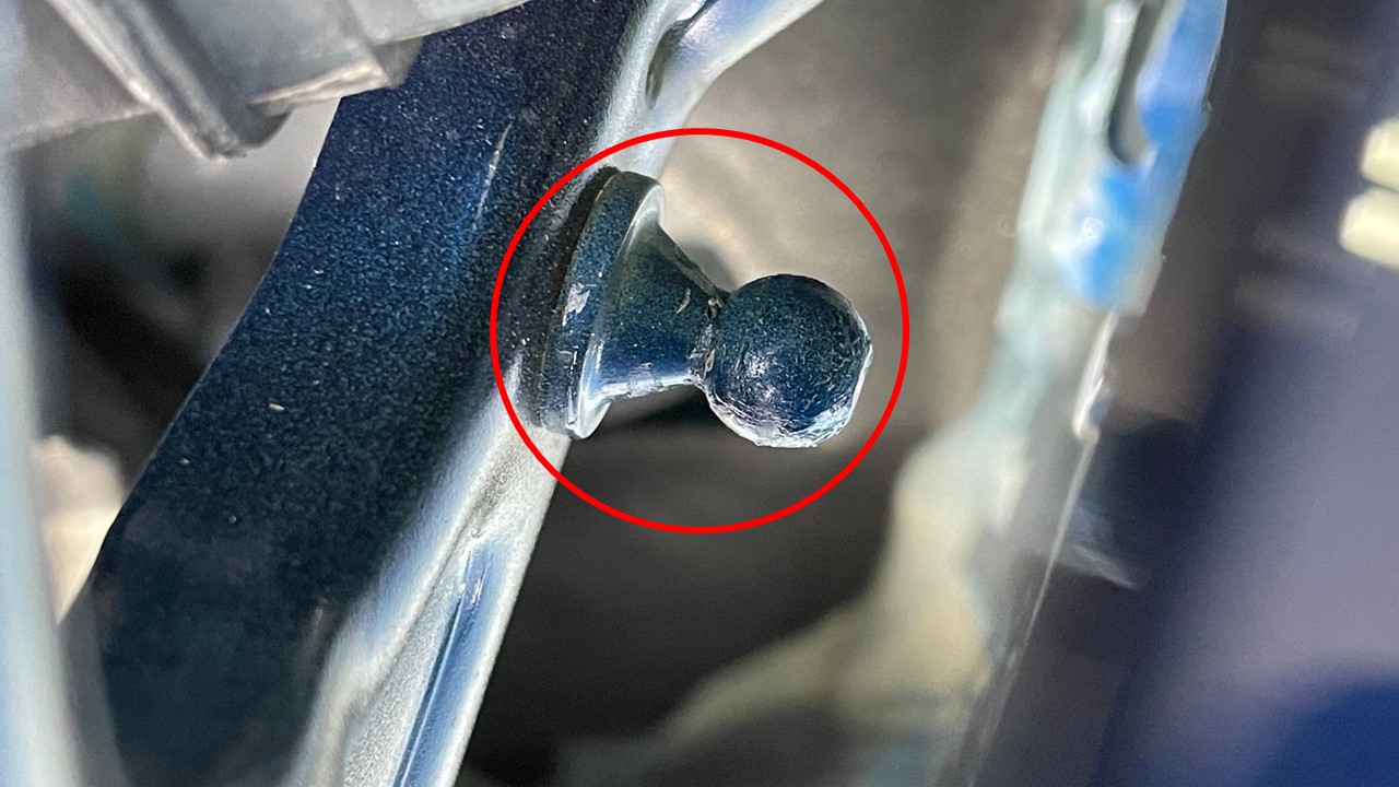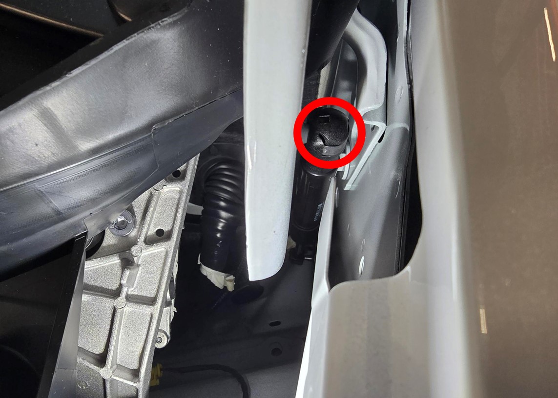 松开将左侧气动支柱固定到前备箱盖铰链的卡子,然后拆下支柱。