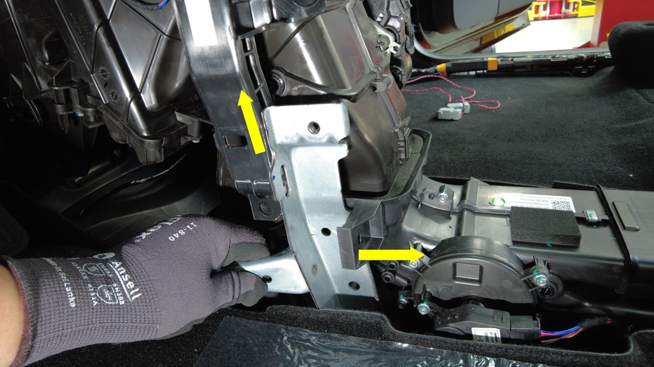 注轻轻向后移动风量分配箱左侧,然后向下插入立板支架。