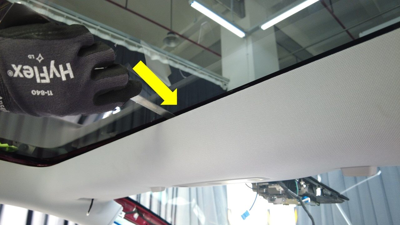 Insert tool through roof glass urethane at rear corner