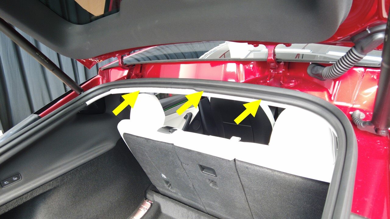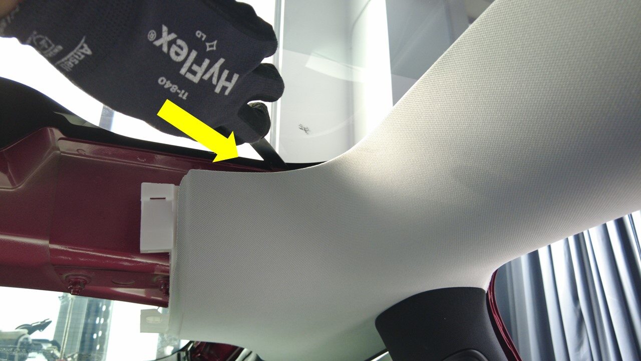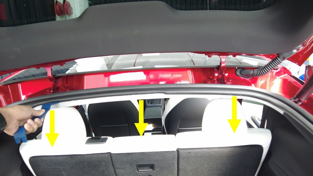 注Make sure nylon string is placed under the seals, Do not damage seals of front windshield and liftgate
