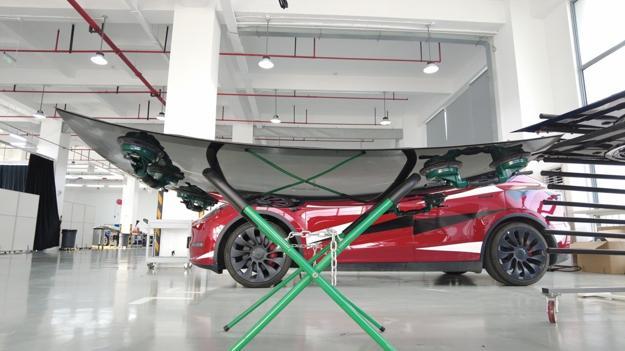 Place new roof glass on support stand and prepare for installation