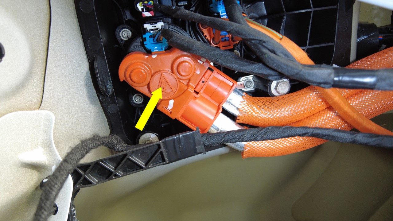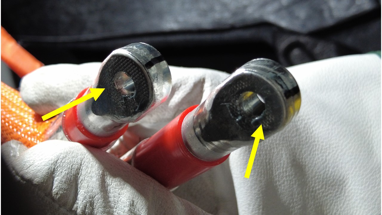在从高压母排引线到充电接口螺柱的每个高压接头处执行 Hioki 电阻测试。可接受的电阻值为 0.050 毫欧(50 微欧)至 0.270 毫欧(270 微欧)。