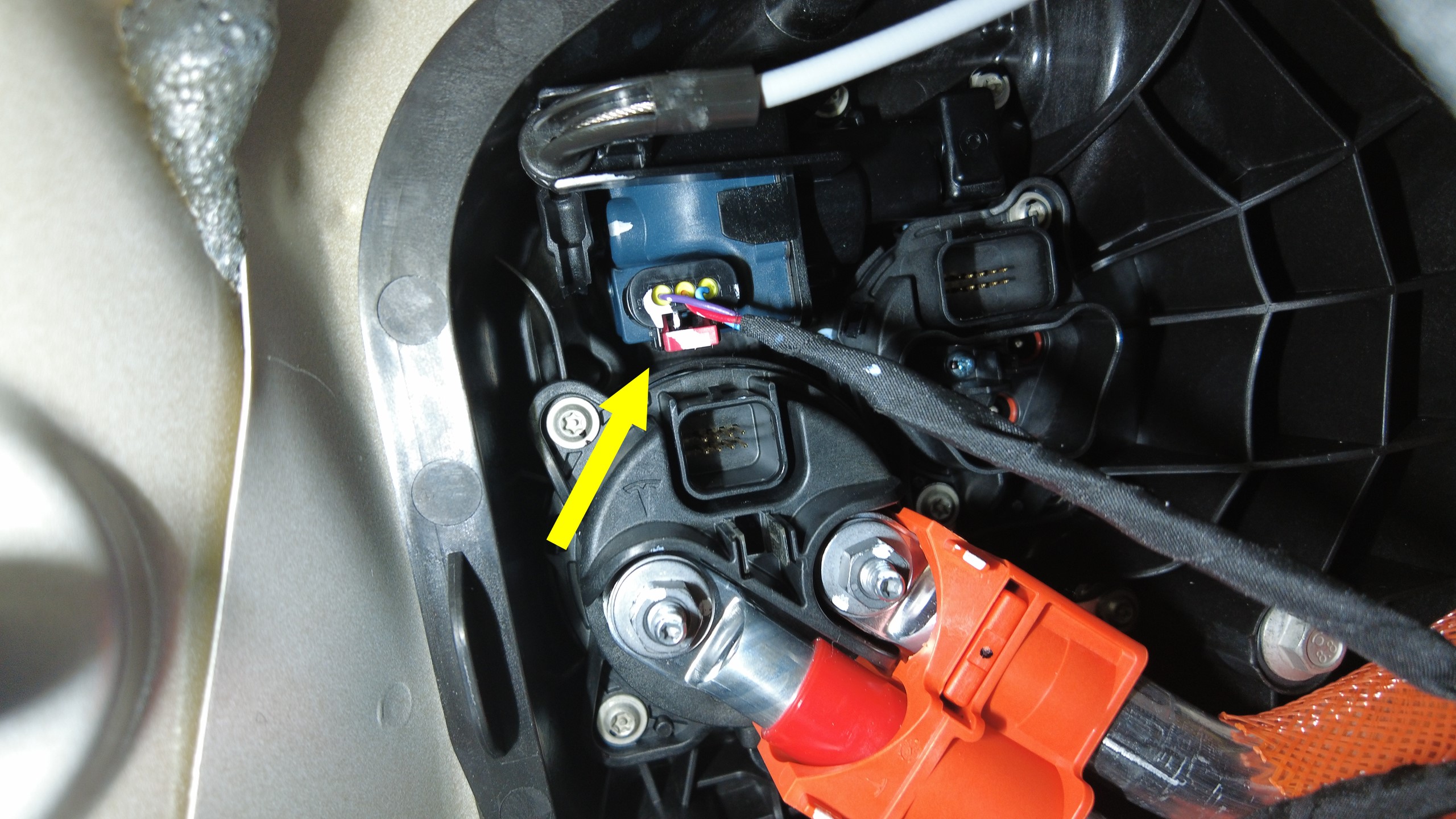 拆下白色锁片,然后将直流逻辑连接器从充电接口总成上断开。