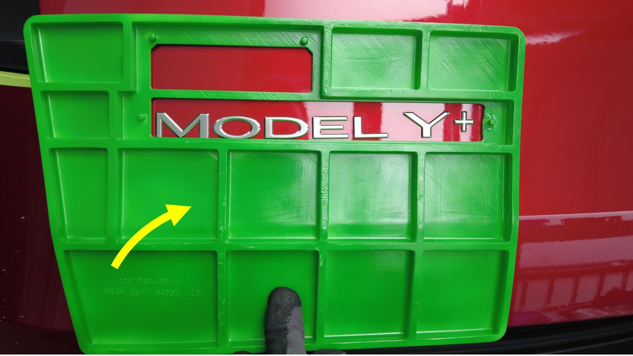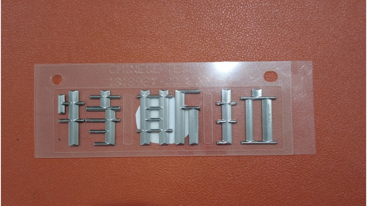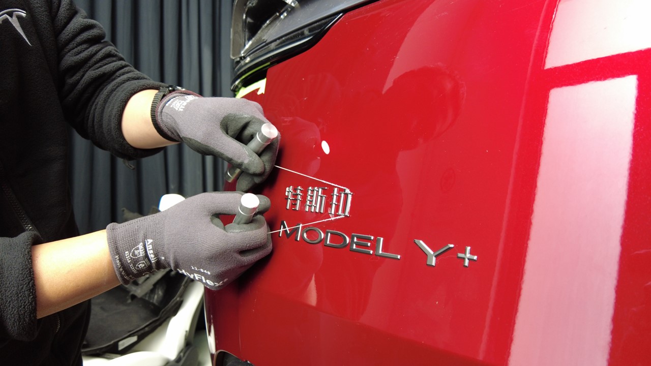 揭下中国 Tesla 徽标上的胶衬,然后将徽标放置在夹具上。将保护膜上的孔与夹具上的销对齐,然后将徽标按压到掀背尾门上。