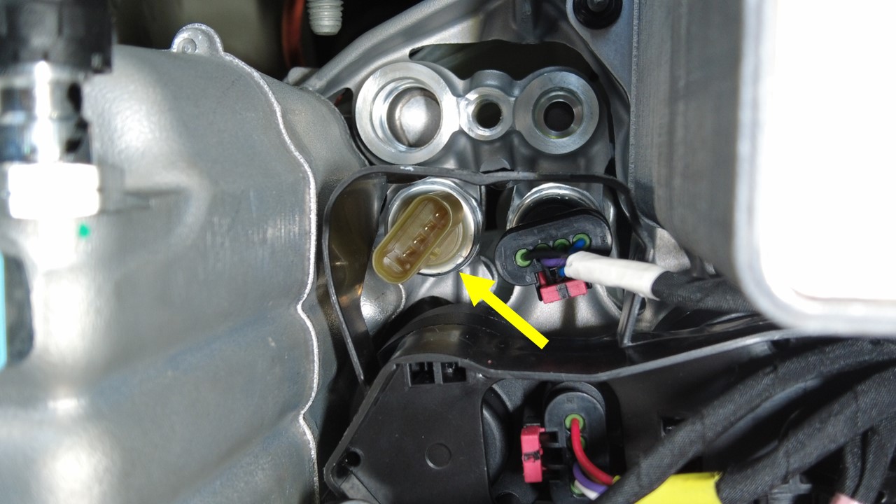 - 手动回退并逐步紧固低压温度传感器,以使传感器 O 型环正确地滑入超级歧管倒角。