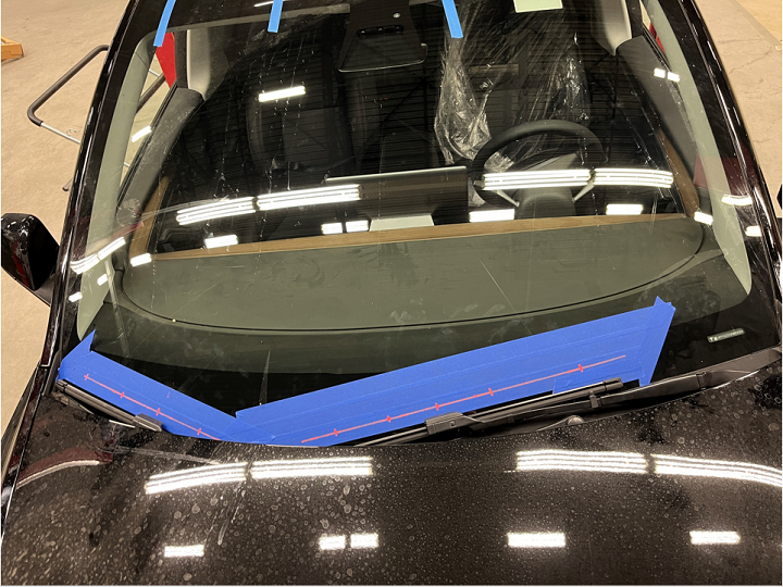 注将喷嘴对准图示参考点。前备箱储物单元呈打开状,仅用于说明。挡风玻璃上粘贴的胶带也仅用于说明。