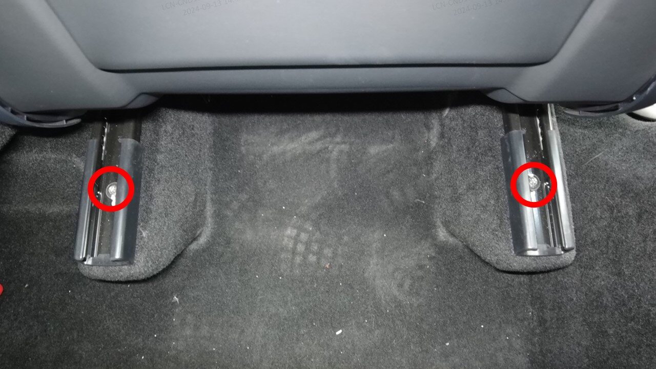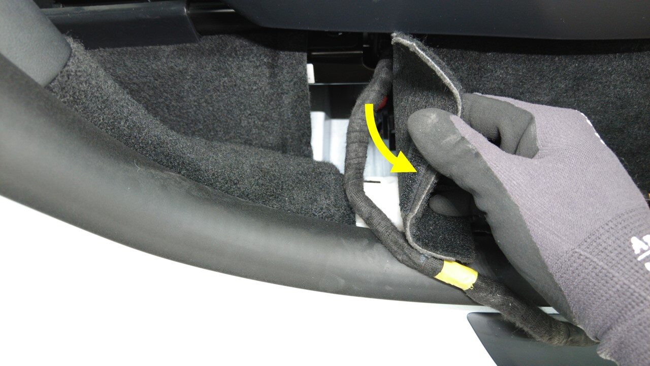 - 将右前座椅线束固定到驾驶室右前地毯下方。