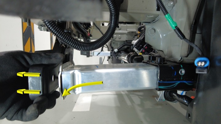 轻轻地将前端支架拉离车辆,然后将左前副车架防撞罐滑入前副车架。