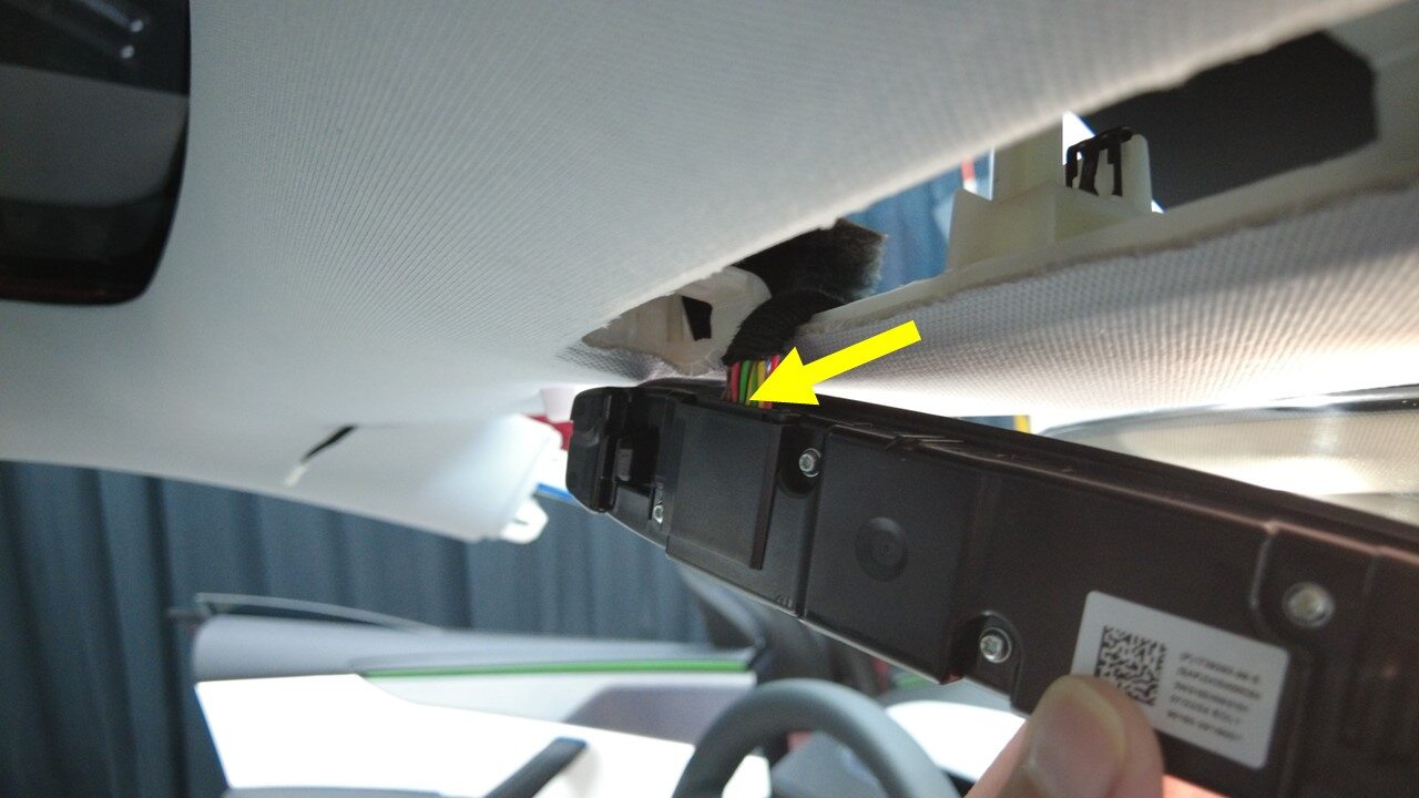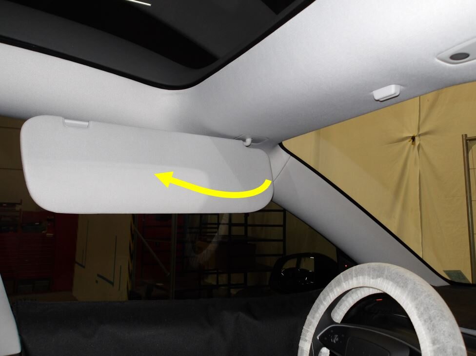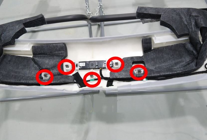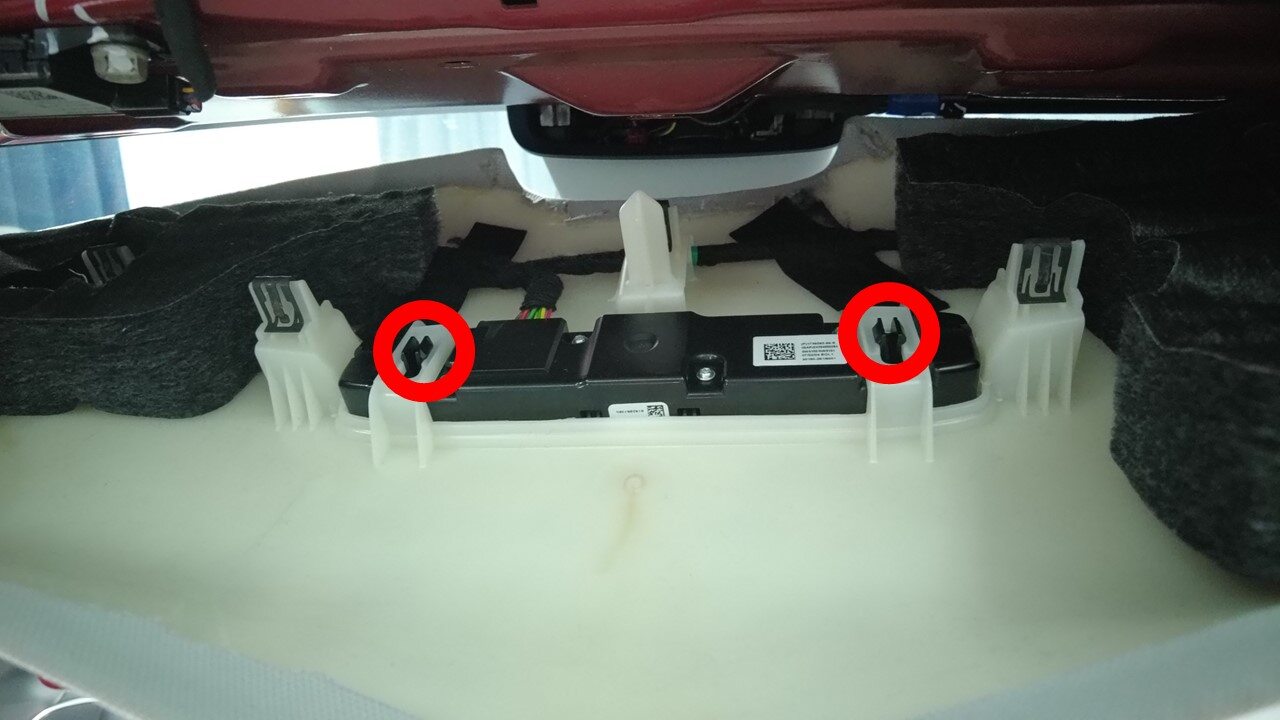 轻轻下拉顶篷以接触顶部控制台。使用一把加长尖嘴钳压住卡子(2 个)两侧锁片,然后将顶部控制台总成朝其背面推动。