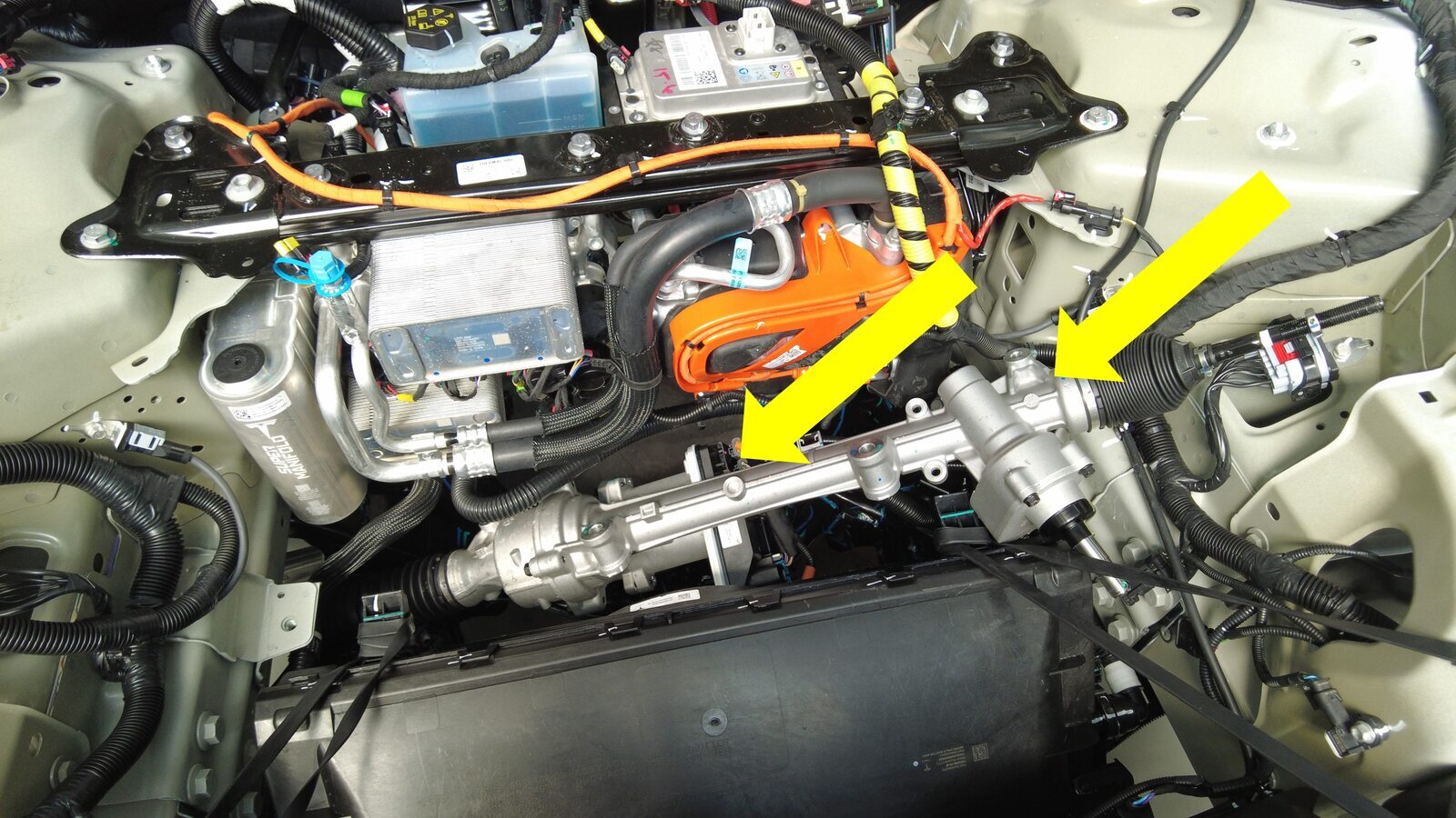 警告请勿损坏任何其他部件。注通过前备箱储物单元的开口安装转向机总成。首先将转向机构总成的 RH 侧安装到前备箱区域,然后将转向机构总成的 LH 侧滑入车内。