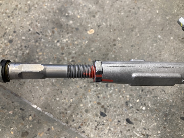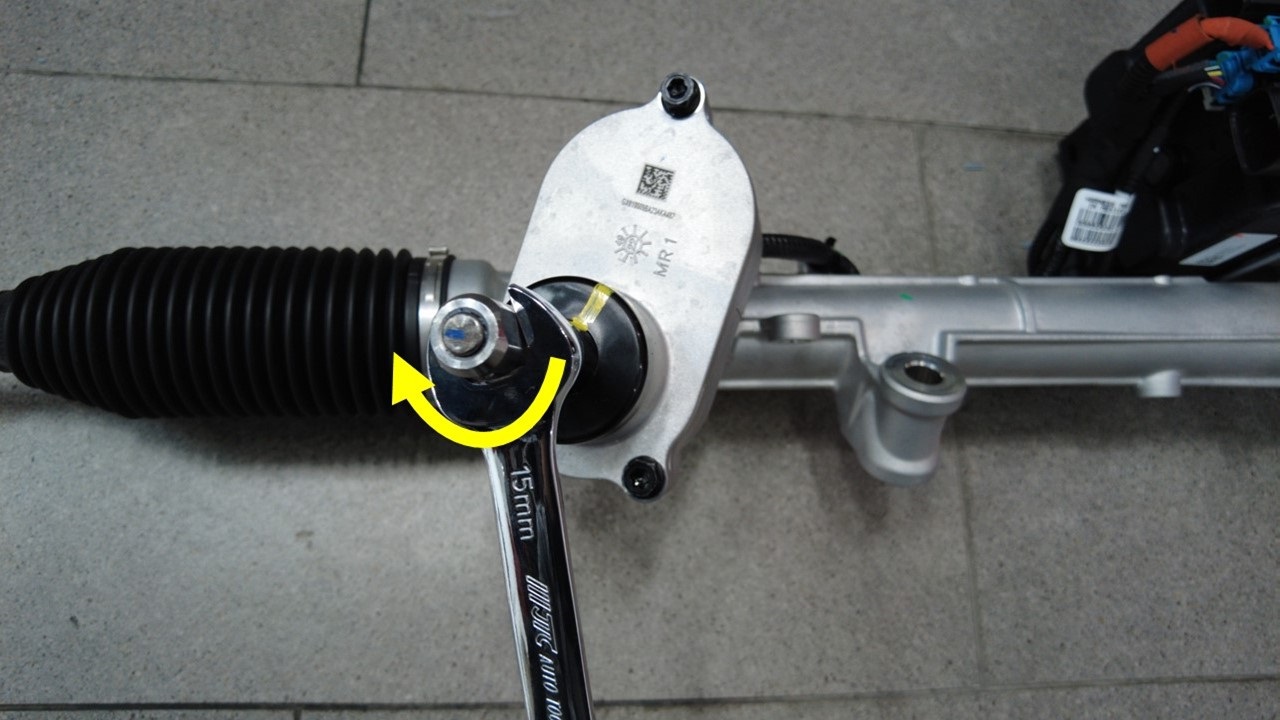 使用油性记号笔在左侧内横拉杆的螺纹和新转向机总成的螺母上做标记。