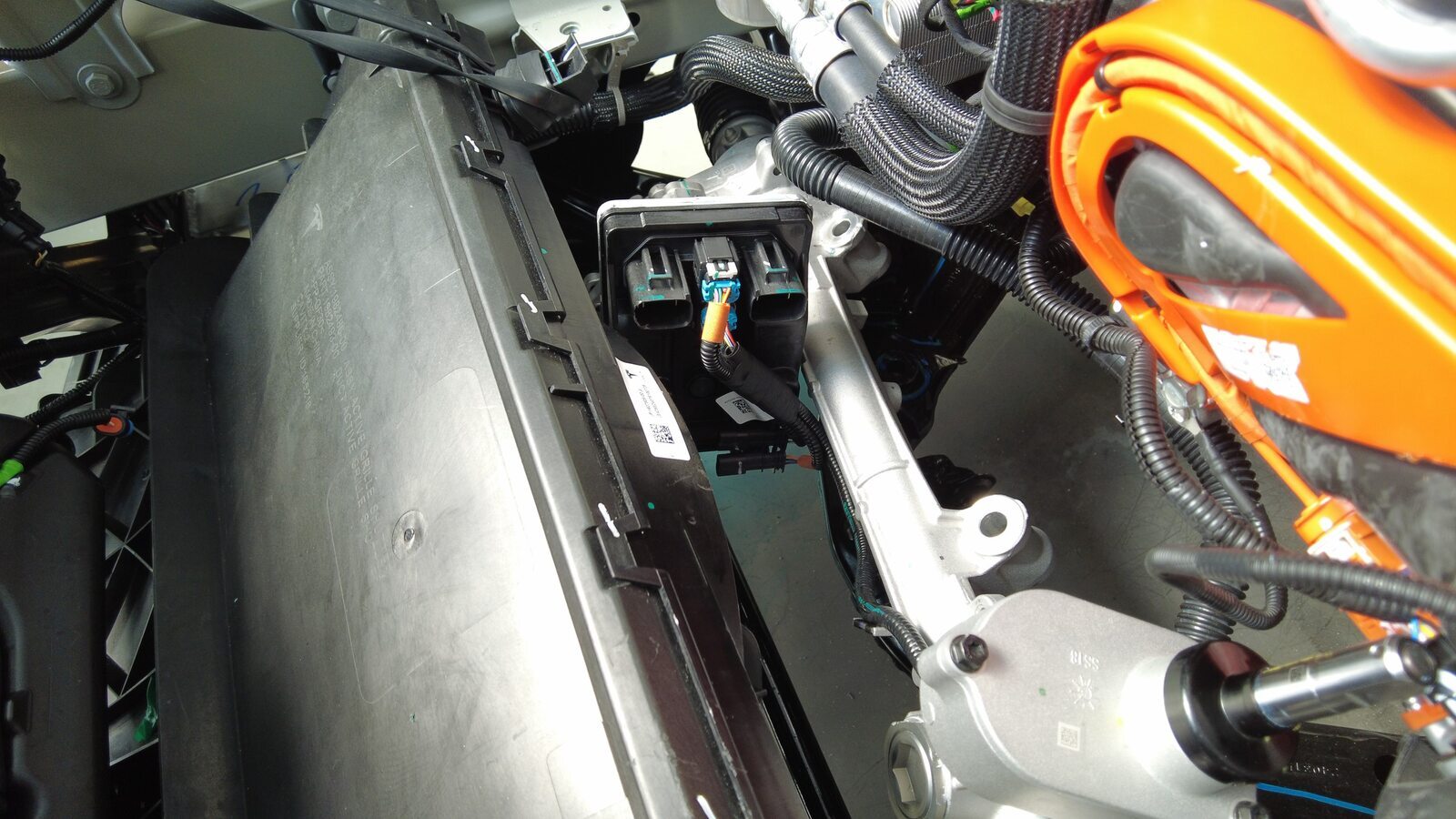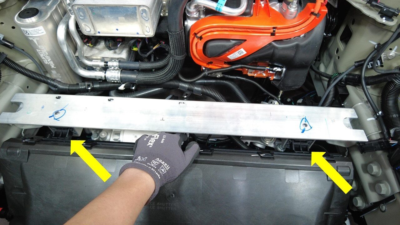 将前备箱储物单元加固支架放置到冷却风扇上,然后安装将前备箱储物单元加固支架固定到冷却风扇的螺栓(2 个)。
