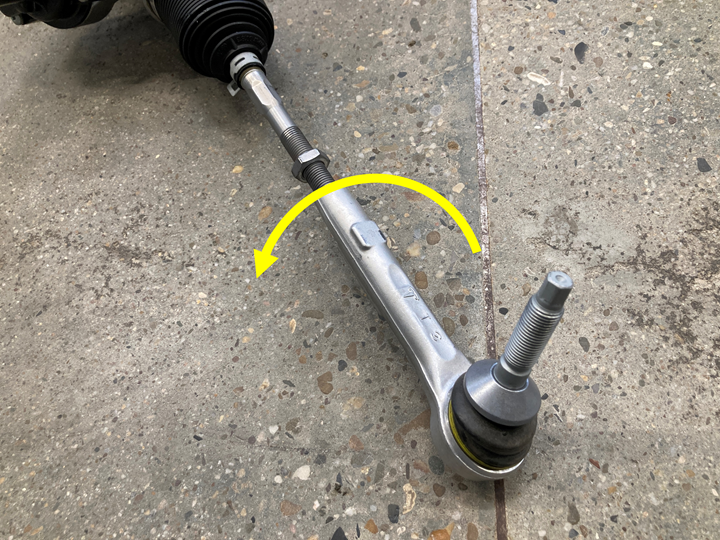 松开左侧外横拉杆上的止动螺母,然后逆时针转动外横拉杆球头,将横拉杆从新的转向机总成上拆下。