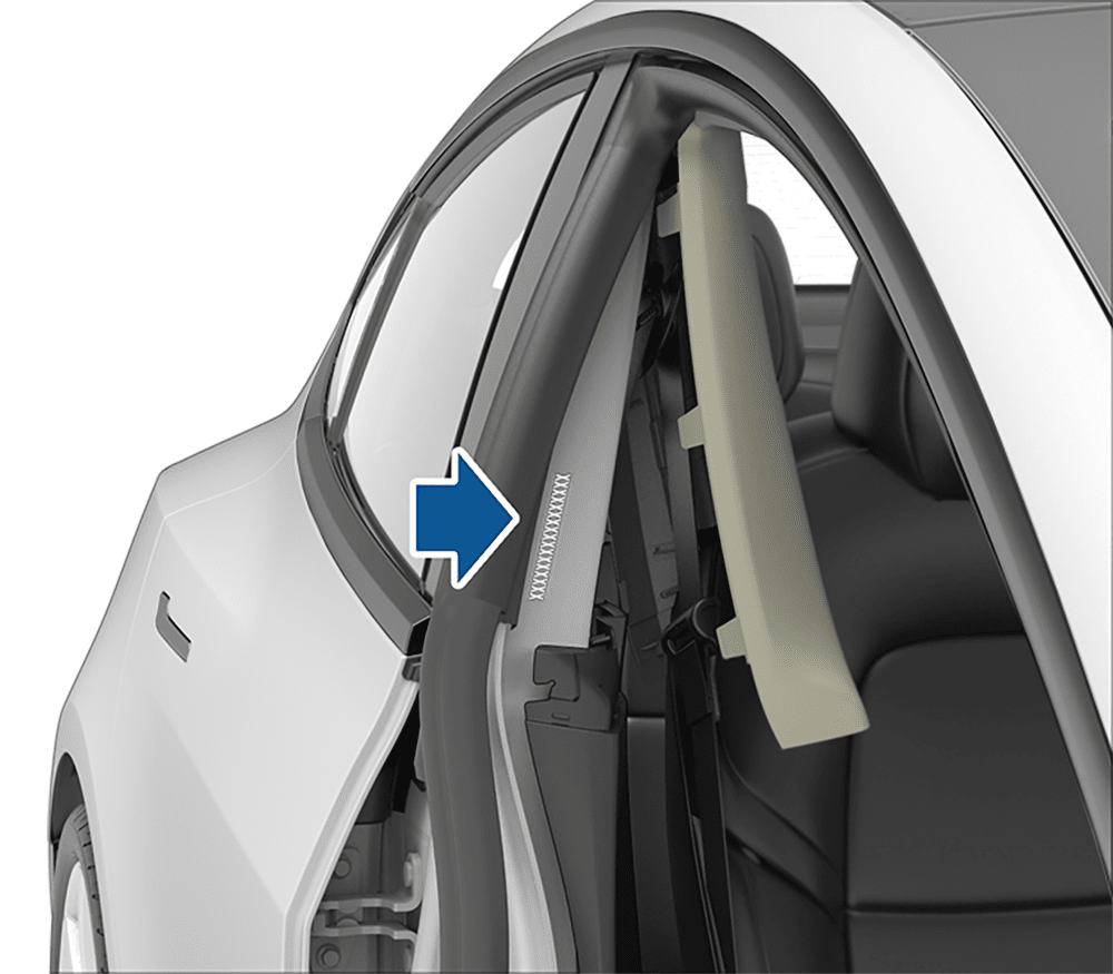 RH 后门槛上;拆下 RH 后门槛饰板时可见(仅适用于柏林超级工厂生产的车辆)