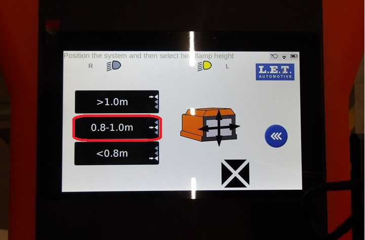 Move the headlight aiming machine following the black arrows on the screen. Once the machine is centered to the headlight, selecting the "X" button will direct you to the aiming screen.