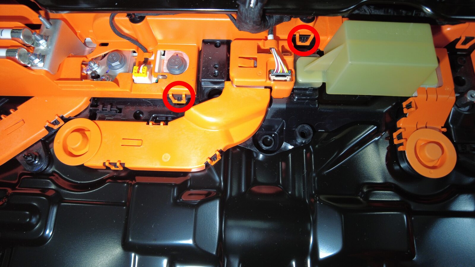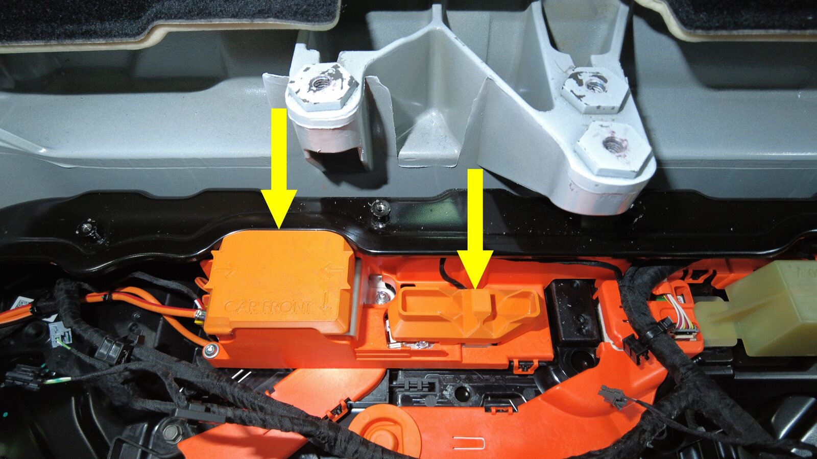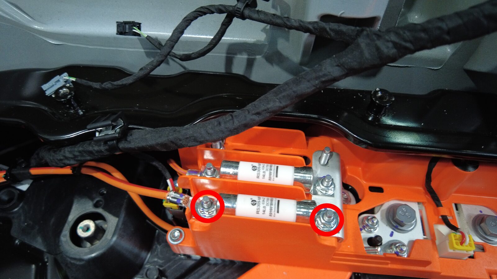 | 将 700V 直流 63A 压缩机保险丝固定到右侧高压电池仓母排罩的螺母(2 个)将 700V 直流 63A 功率转换系统输出保险丝固定到右侧高压电池仓母排罩的螺母 |