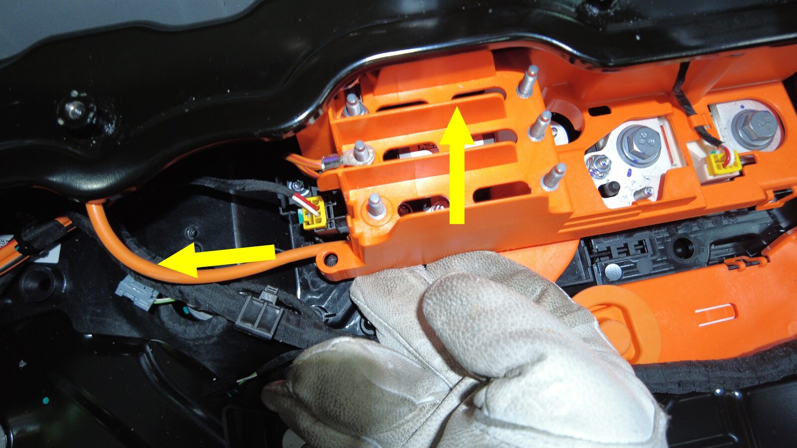 割断将超级线束固定到充电器输出至直流总线线束的电缆扎带。