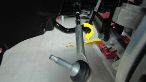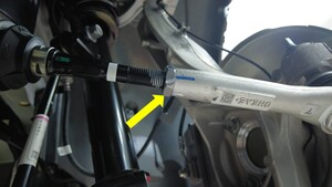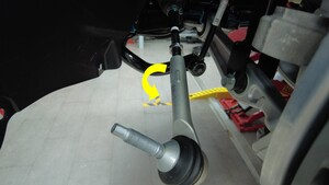 - 用油性记号笔在横拉杆和止动螺母上标出证示标记,以便稍后在左横拉杆球头安装期间重新对齐两者。