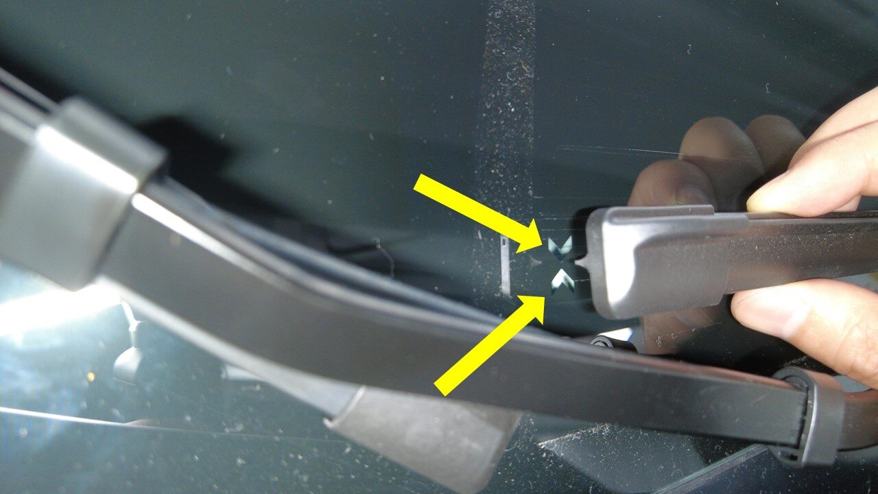 将右侧雨刮器臂和雨刮器片总成放置到车辆上。确保雨刮器顶端对准挡风玻璃角部的两个指示之间。