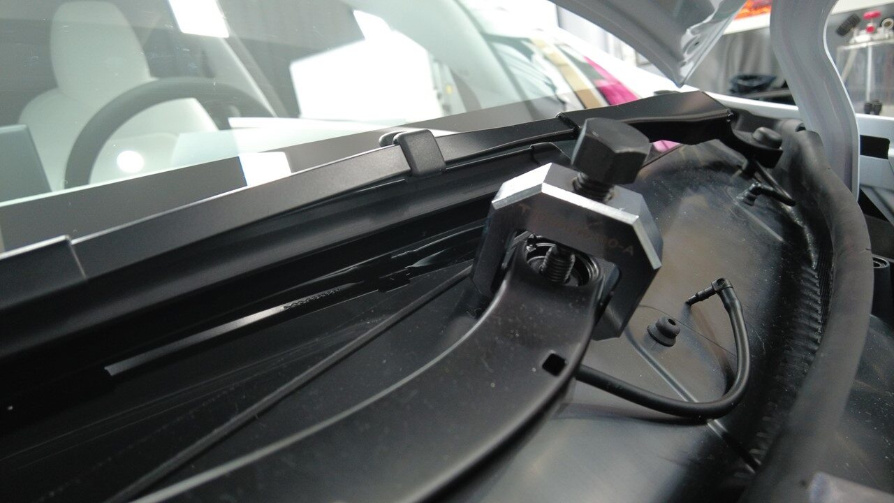 使用雨刮器臂拆卸工具 (1058696-00-B) 将右侧雨刮器臂和雨刮器片总成从车辆上拆下。