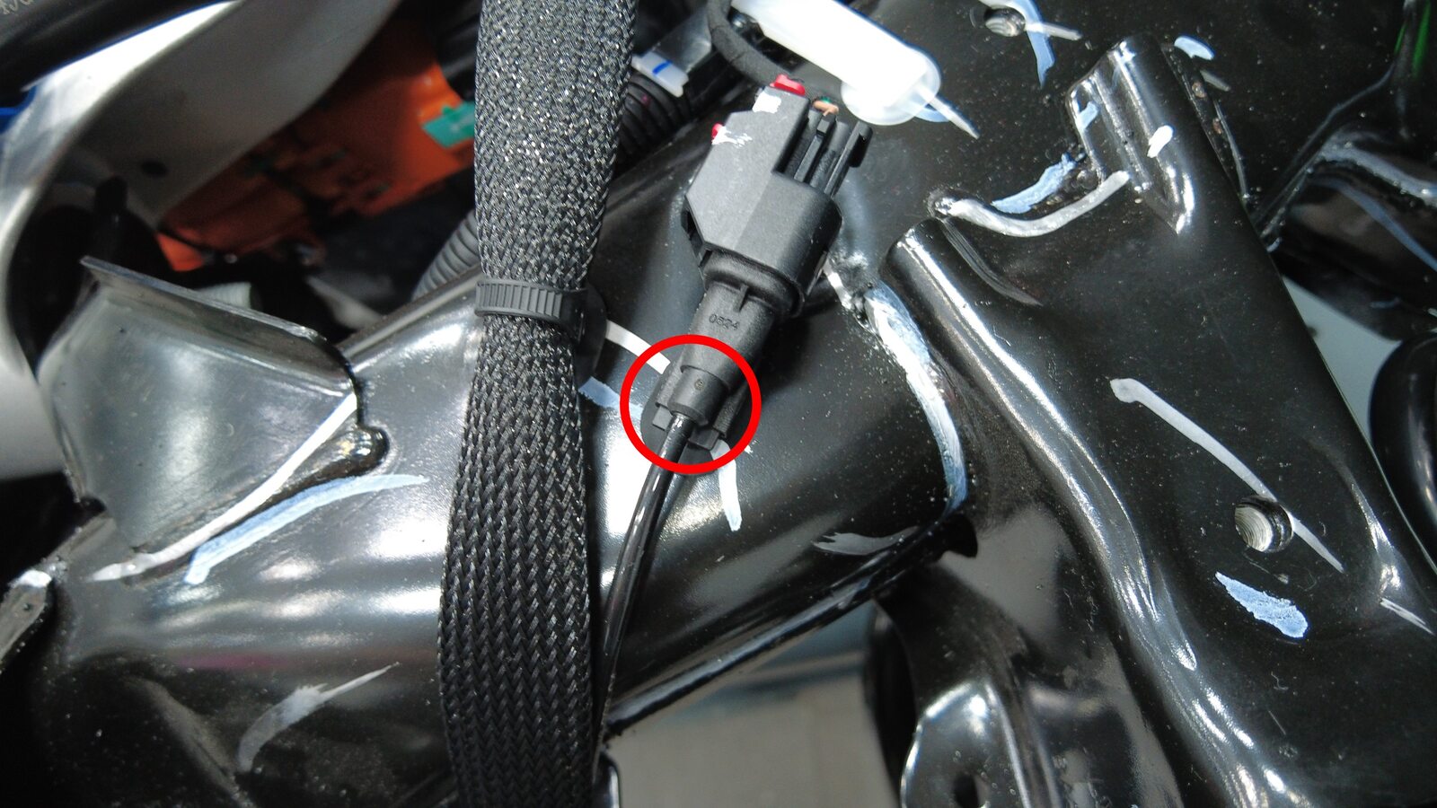 注用手固定住副车架线束上的连接器的端部。