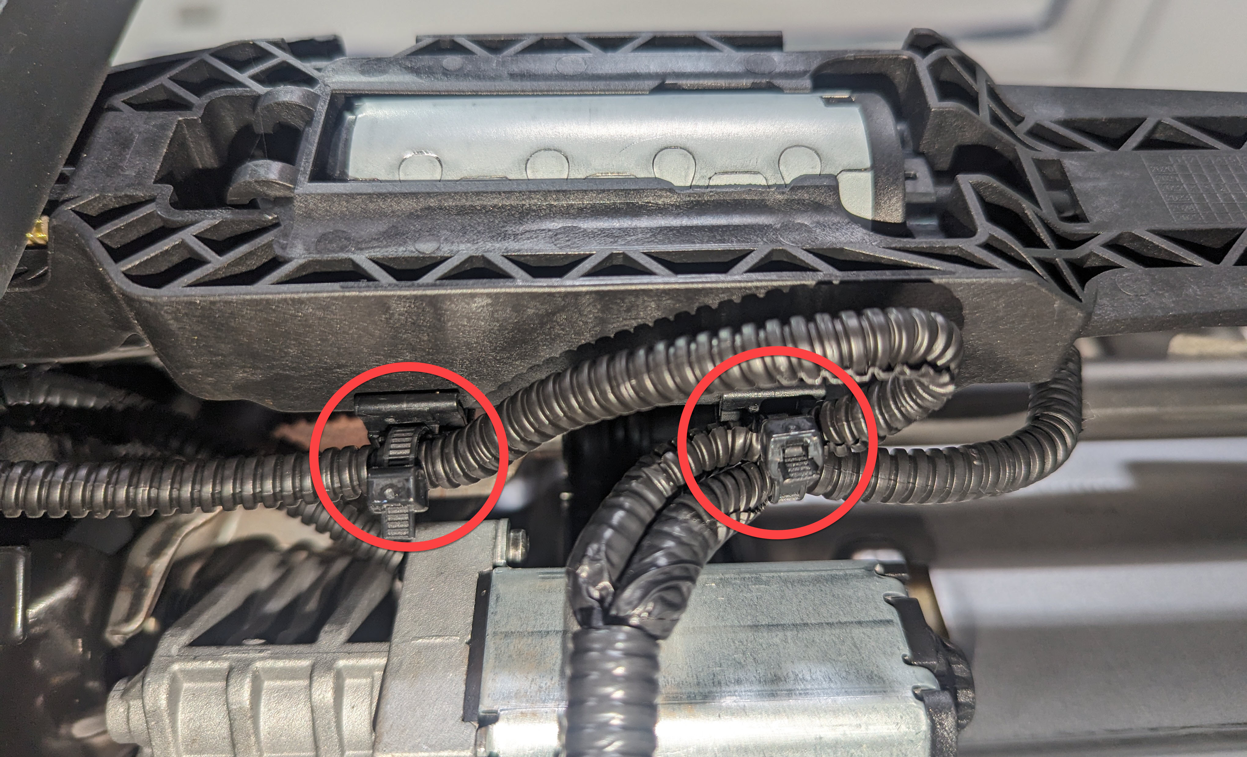 Remove the harness retaining clip under the tilt motor