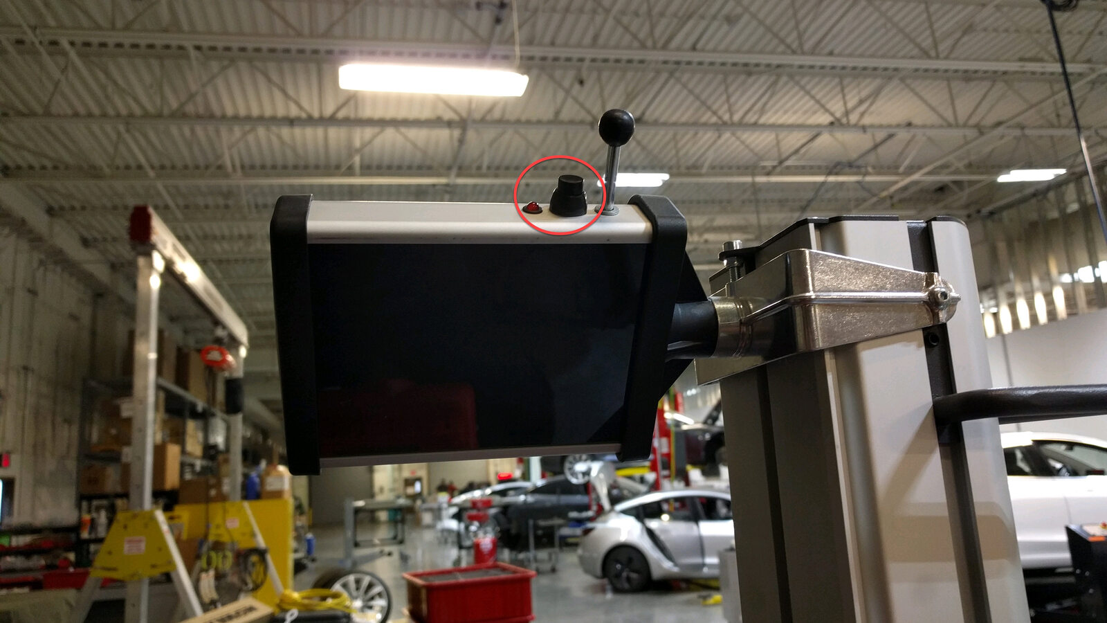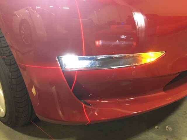 注Set to the height of the aligner marker on the aligner post after adjusting the headlight aimer horizontally and vertically so that the headlight laser guide crosshair is at the center of the fog light. Height is different for different model versions (Dual Motor and Performance, for example).
