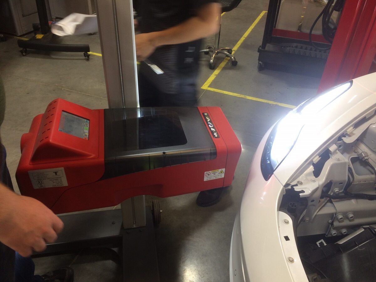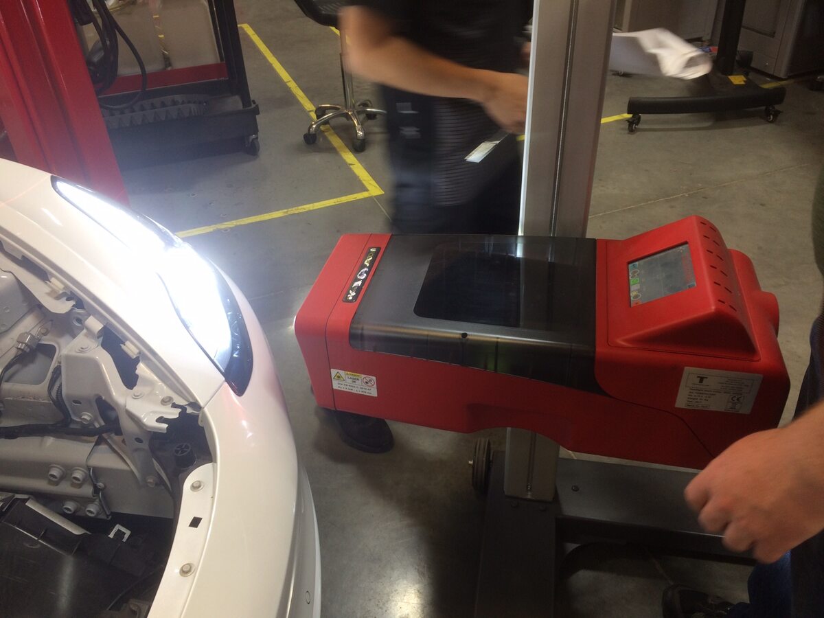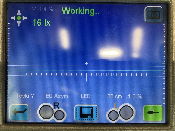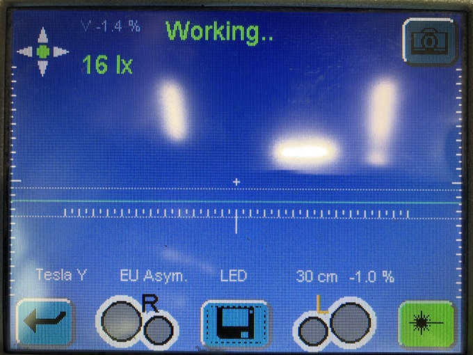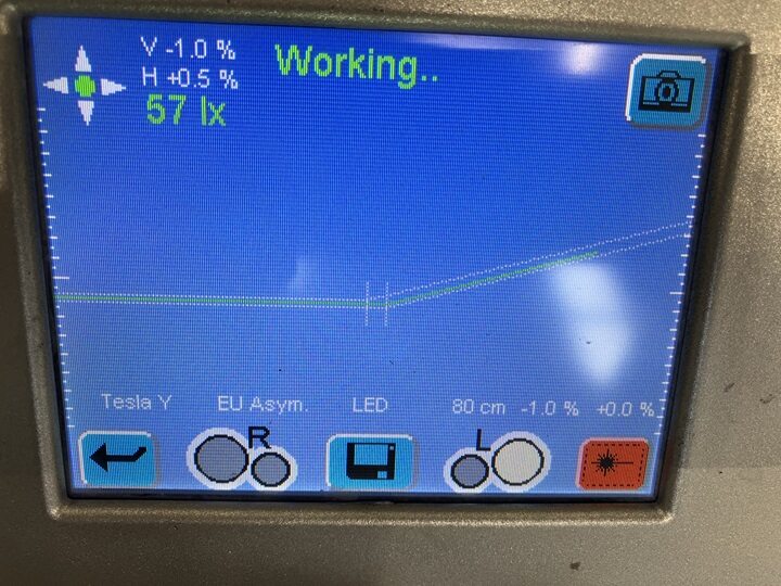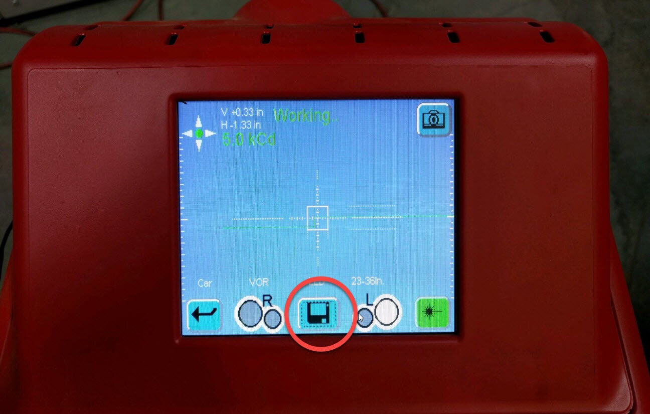 Turn on the laser aimer to adjust the tester horizontal and vertical position to the LH headlight marking. Set to approximately 81 cm height on the post. A piece of paper can aid in finding the center point. Turn off the laser aimer before proceeding to the next step.