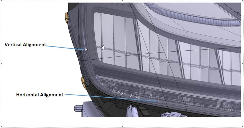 注Use visor/laser to line up the tester perpendicular to the axis between the hood strut furthest fender bolts. If the headlight aimer can move between the RH and LH headlights while maintaining the same laser angle projected onto the hood struts, it is set correctly (perpendicular) to the vehicle.
