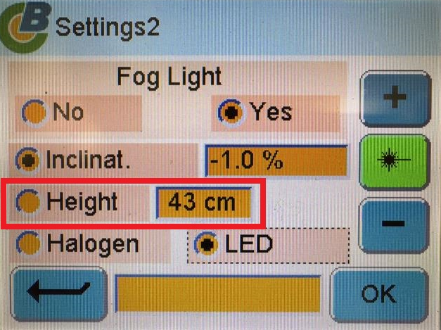 Select the fog light Height on the headlight aimer.